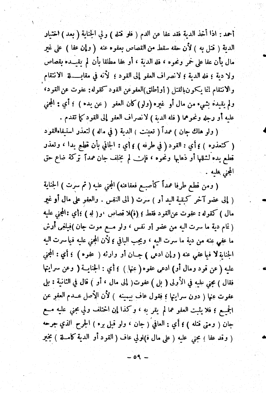 أَحْمَدُ: إذَا أَخَذَ الدِّيَةَ فَقَدْ عَفَا عَنْ الدَّمِ (فَلَوْ قَتَلَهُ) وَلِيُّ الْجِنَايَةِ (بَعْدَ) اخْتِيَارِ الدِّيَةِ (قُتِلَ بِهِ) لِأَنَّ حَقَّهُ سَقَطَ مِنْ الْقِصَاصِ بِعَفْوِهِ عَنْهُ (وَإِنْ عَفَا) عَلَى غَيْرِ مَالٍ بِأَنْ عَفَا عَلَى خَمْرٍ وَنَحْوِهِ، فَلَهُ الدِّيَةُ، أَوْ عَفَا مُطْلَقًا بِأَنْ لَمْ يُقَيِّدْهُ بِقِصَاصٍ وَلَا دِيَةٍ؛ فَلَهُ الدِّيَةُ؛ لِانْصِرَافِ الْعَفْوِ إلَى الْقَوَدِ؛ لِأَنَّهُ فِي مُقَابَلَةِ الِانْتِقَامِ، وَالِانْتِقَامُ إنَّمَا يَكُونُ بِالْقَتْلِ (أَوْ أَطْلَقَ) الْعَفْوَ عَنْ الْقَوَدِ كَقَوْلِهِ: عَفَوْت عَنْ الْقَوَدِ، وَلَمْ يُقَيِّدْهُ بِشَيْءٍ مِنْ مَالٍ أَوْ غَيْرِهِ (وَلَوْ) كَانَ الْعَفْوُ (عَنْ يَدِهِ) أَيْ: الْمَجْنِيِّ عَلَيْهِ أَوْ رِجْلِهِ وَنَحْوِهِمَا (فَلَهُ الدِّيَةُ) ؛ لِانْصِرَافِ الْعَفْوِ إلَى الْقَوَدِ كَمَا تَقَدَّمَ.
