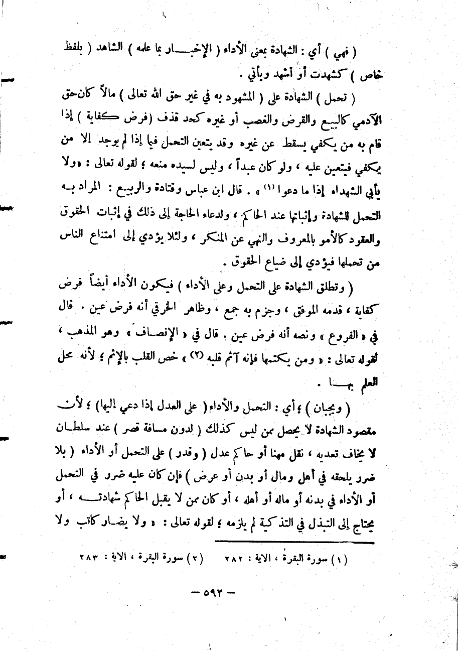 قَالَ ابْنُ عَبَّاسٍ وَقَتَادَةُ وَالرَّبِيعُ: الْمُرَادُ بِهِ التَّحَمُّلُ لِلشَّهَادَةِ وَإِثْبَاتُهَا عِنْدَ الْحَاكِمِ، وَلِدُعَاءِ الْحَاجَةِ إلَى ذَلِكَ فِي إثْبَاتِ الْحُقُوقِ وَالْعُقُودِ كَالْأَمْرِ بِالْمَعْرُوفِ وَالنَّهْيِ عَنْ الْمُنْكَرِ، وَلِئَلَّا يُؤَدِّيَ إلَى امْتِنَاعِ النَّاسِ مِنْ تَحَمُّلِهَا فَيُؤَدِّيَ إلَى ضَيَاعِ الْحُقُوقِ. .