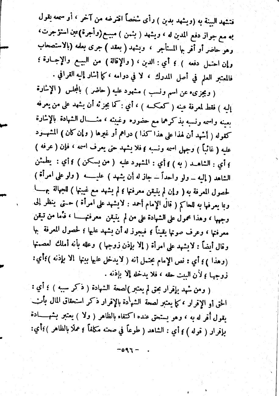 فَتَشْهَدُ الْبَيِّنَةُ بِهِ (وَيَشْهَدُ بِدَيْنٍ) مَنْ رَأَى شَخْصًا اقْتَرَضَهُ مِنْ آخَرَ، أَوْ سَمِعَهُ يَقُولُ بِهِ مَعَ جَوَازِ دَفْعِ الْمَدِينِ لَهُ، وَيَشْهَدُ (بِثَمَنِ) مَبِيعٍ (وَأُجْرَةِ) عَيْنٍ اُسْتُؤْجِرَتْ، وَهُوَ حَاضِرٌ أَوْ أَقَرَّ بِهَا الْمُسْتَأْجِرُ، وَيَشْهَدُ (بِعَقْدٍ) جَرَى بِعِلْمِهِ (بِالِاسْتِصْحَابِ وَإِنْ اُحْتُمِلَ دَفْعُهُ) ؛ أَيْ: الدَّيْنِ، (وَالْإِقَالَةِ) مِنْ الْبَيْعِ وَالْإِجَارَةِ؛ فَالْمُعْتَبَرُ الْعِلْمُ فِي أَصْلِ الْمُدْرَكِ، لَا فِي دَوَامِهِ، كَمَا أَشَارَ إلَيْهِ الْقَرَافِيُّ. .