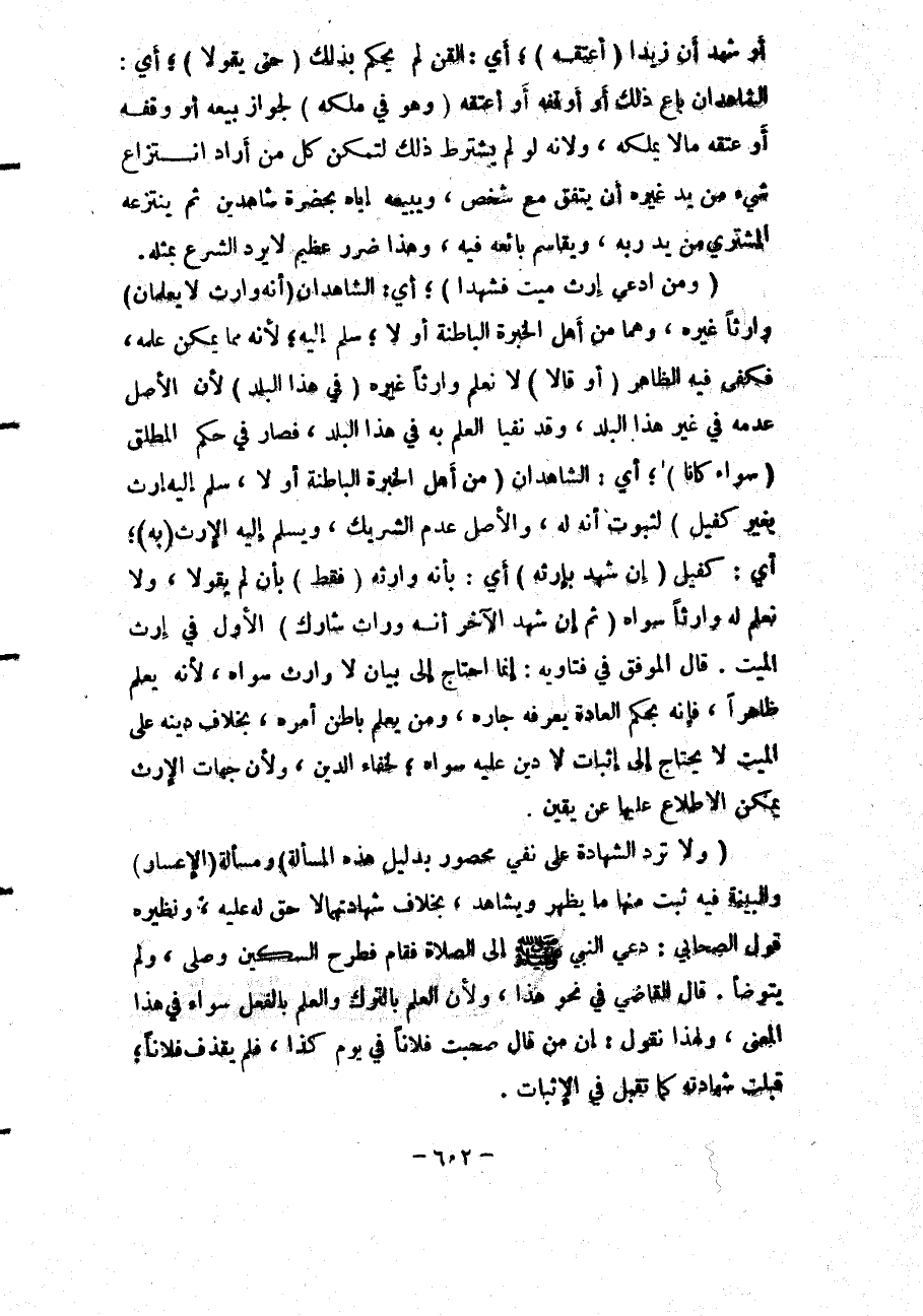 أَوْ شَهِدَ أَنَّ زَيْدًا (أَعْتَقَهُ) أَيْ: الْقِنَّ لَمْ يُحْكَمْ بِذَلِكَ (حَتَّى يَقُولَا) أَيْ: الشَّاهِدَانِ بَاعَ ذَلِكَ أَوْ أَوْقَفَهُ أَوْ أَعْتَقَهُ (وَهُوَ فِي مِلْكِهِ) لِجَوَازِ بَيْعِهِ أَوْ وَقْفِهِ أَوْ عِتْقِهِ مَا لَا يَمْلِكُهُ، وَلِأَنَّهُ لَوْ لَمْ يُشْتَرَطْ ذَلِكَ لَتَمَكَّنَ كُلُّ مَنْ أَرَادَ انْتِزَاعَ شَيْءٍ مِنْ يَدِ غَيْرِهِ أَنْ يَتَّفِقَ مَعَ شَخْصٍ، وَيَبِيعَهُ إيَّاهُ بِحَضْرَةِ شَاهِدَيْنِ ثُمَّ يَنْتَزِعَهُ الْمُشْتَرِي مِنْ يَدِ رَبِّهِ، وَيُقَاسِمَ بَائِعَهُ فِيهِ، وَهَذَا ضَرَرٌ عَظِيمٌ لَا يَرِدُ الشَّرْعُ بِمِثْلِهِ.