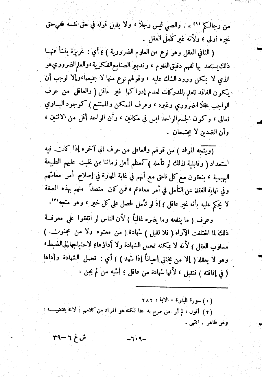 (الثَّانِي الْعَقْلُ وَهُوَ نَوْعٌ مِنْ الْعُلُومِ الضَّرُورِيَّةِ) ؛ أَيْ: غَرِيزَةٌ يَنْشَأُ عَنْهَا ذَلِكَ يَسْتَعِدُّ بِهَا لِفَهْمِ دَقِيقِ الْعُلُومِ، وَتَدْبِيرِ الصَّنَائِعِ الْفِكْرِيَّةِ، وَالْعِلْمُ الضَّرُورِيُّ هُوَ الَّذِي لَا يُمْكِنُ وُرُودُ الشَّكِّ عَلَيْهِ، وَقَوْلُهُمْ نَوْعٌ مِنْهَا لَا جَمِيعَهَا، وَإِلَّا لَوَجَبَ أَنْ يَكُونَ الْفَاقِدُ لِلْعِلْمِ بِالْمُدْرَكَاتِ لِعَدَمِ إدْرَاكِهَا غَيْرَ عَاقِلٍ (وَالْعَاقِلُ مَنْ عَرَفَ الْوَاجِبَ عَقْلًا الضَّرُورِيَّ وَغَيْرَهُ، وَعَرَفَ الْمُمْكِنَ وَالْمُمْتَنِعَ) كَوُجُودِ الْبَارِي تَعَالَى، وَكَوْنِ الْجِسْمِ الْوَاحِدِ لَيْسَ فِي مَكَانَيْنِ، وَأَنَّ الْوَاحِدَ أَقَلُّ مِنْ الِاثْنَيْنِ، وَأَنَّ الضِّدَّيْنِ لَا يَجْتَمِعَانِ. (وَيَتَّجِهُ الْمُرَادُ) مِنْ قَوْلِهِمْ وَالْعَاقِلُ مَنْ عَرَفَ إلَى آخِرِهِ إذَا كَانَ فِيهِ اسْتِعْدَادٌ (وَقَابِلِيَّةٌ لِذَلِكَ لَوْ تَأَمَّلَهُ) كَمُعْظَمِ أَهْلِ زَمَانِنَا مِمَّنْ غَلَبَتْ عَلَيْهِمْ الطَّبِيعَةُ الْبَهِيمِيَّةُ، يَنْعَقُونَ مَعَ كُلِّ نَاعِقٍ مَعَ أَنَّهُمْ فِي غَايَةِ الْمَهَارَةِ فِي إصْلَاحِ أَمْرِ مَعَاشِهِمْ وَفِي نِهَايَةِ الْغَفْلَةِ عَنْ التَّأَمُّلِ فِي أَمْرِ مَعَادِهِمْ، فَمَنْ كَانَ مُتَّصِفًا مِنْهُمْ بِهَذِهِ الصِّفَةِ لَا يُحْكَمُ عَلَيْهِ بِأَنَّهُ غَيْرُ عَاقِلٍ؛ إذْ لَوْ تَأَمَّلَ لَحَصَلَ عَلَى كُلِّ خَيْرٍ، وَهُوَ مُتَّجِهٌ وَعَرَفَ (مَا يَنْفَعُهُ وَمَا يَضُرُّهُ غَالِبًا) لِأَنَّ النَّاسَ لَوْ اتَّفَقُوا عَلَى مَعْرِفَةِ ذَلِكَ لَمَا اخْتَلَفَتْ الْآرَاءُ (فَلَا تُقْبَلُ) شَهَادَةٌ (مِنْ مَعْتُوهٍ وَلَا مِنْ مَجْنُونٍ) مَسْلُوبِ الْعَقْلِ، وَلِأَنَّهُ لَا يُمْكِنُهُ تَحَمُّلُ الشَّهَادَةِ وَلَا أَدَاؤُهَا، لِاحْتِيَاجِهَا إلَى الضَّبْطِ وَهُوَ لَا يَعْقِلُهُ (إلَّا مَنْ يَخْنُقُ أَحْيَانًا إذَا شَهِدَ) أَيْ: تَحَمَّلَ الشَّهَادَةَ وَأَدَّاهَا (فِي إفَاقَتِهِ) فَتُقْبَلُ، لِأَنَّهَا شَهَادَةٌ مِنْ عَاقِلٍ، أَشْبَهَ مَنْ لَمْ يُجَنَّ.