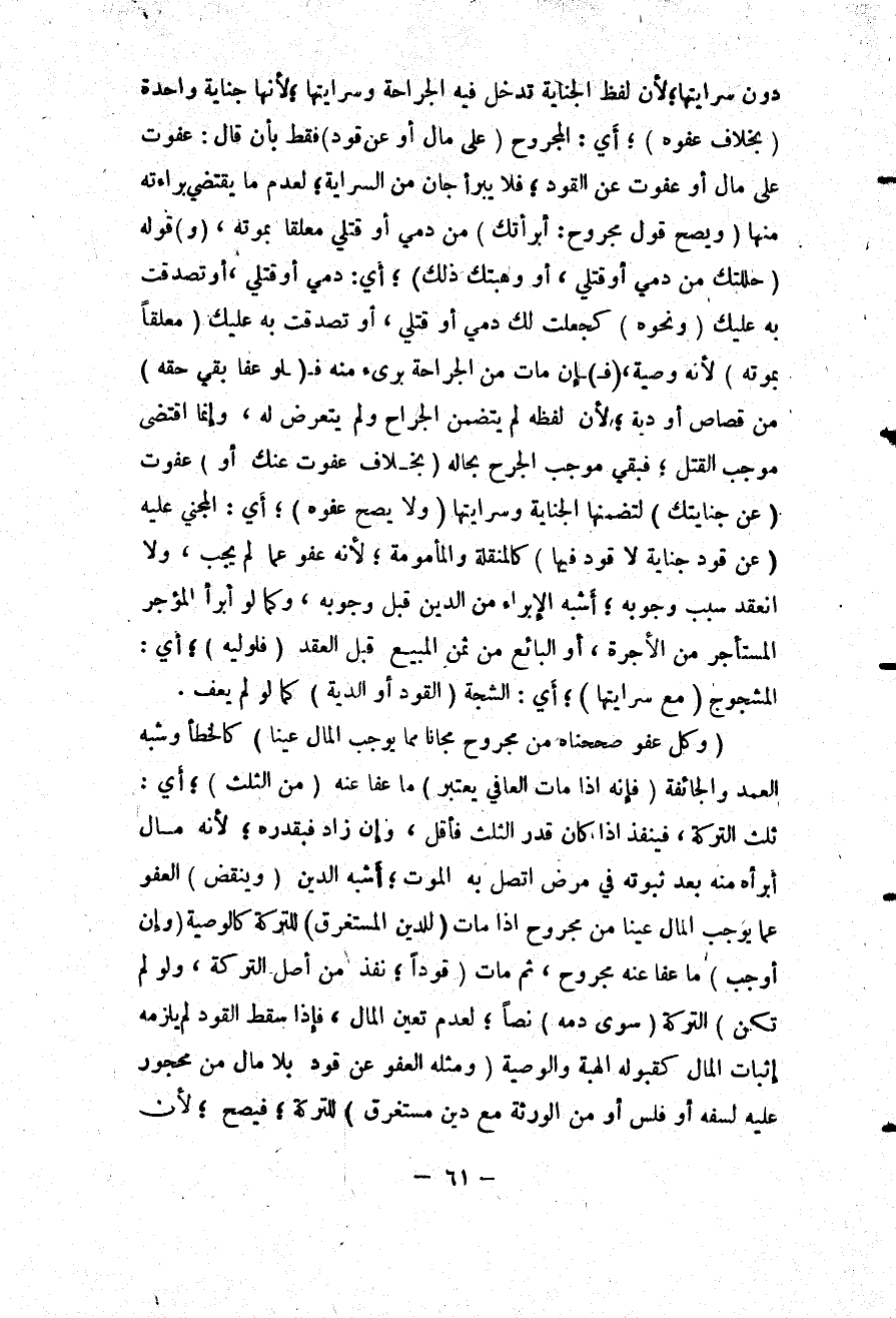دُونَ سِرَايَتِهَا؛ لِأَنَّ لَفْظَ الْجِنَايَةِ تَدْخُلُ فِيهِ الْجِرَاحَةُ وَسِرَايَتُهَا؛ لِأَنَّهَا جِنَايَةٌ وَاحِدَةٌ (بِخِلَافِ عَفْوِهِ) ؛ أَيْ: الْمَجْرُوحِ (عَلَى مَالٍ أَوْ عَنْ قَوَدٍ) فَقَطْ بِأَنْ قَالَ: عَفَوْت عَلَى مَالٍ أَوْ عَفَوْت عَنْ الْقَوَدِ؛ فَلَا يَبْرَأُ جَانٍ مِنْ السِّرَايَةِ؛ لِعَدَمْ مَا يَقْتَضِي بَرَاءَتُهُ مِنْهَا (وَيَصِحُّ قَوْلُ مَجْرُوحٍ: أَبْرَأْتُك) مِنْ دَمِي أَوْ قَتْلِي مُعَلِّقًا بِمَوْتِهِ، (وَ) قَوْلُهُ (حَلَلْتُك مِنْ دَمِي أَوْ قَتْلِي، أَوْ وَهَبْتُك ذَلِكَ) ؛ أَيْ: دَمِي أَوْ قَتْلِي، أَوْ تَصَدَّقْت بِهِ عَلَيْك (وَنَحْوُهُ) كَ جَعَلْت لَك دَمِي أَوْ قَتْلِي، أَوْ تَصَدَّقْت بِهِ عَلَيْك (مُعَلِّقًا بِمَوْتِهِ) ؛ لِأَنَّهُ وَصِيَّةٌ، (فَ) إنْ مَاتَ مِنْ الْجِرَاحَةِ بَرِئَ مِنْهُ فَ (لَوْ عَفَا بَقِيَ حَقَّهُ) مِنْ قِصَاصٍ أَوْ دِيَةٍ؛ لِأَنَّ لَفْظَهُ لَمْ يَتَضَمَّنْ الْجِرَاحَ وَلَمْ يَتَعَرَّضْ لَهُ، وَإِنَّمَا اقْتَضَى مُوجِبَ الْقَتْلِ؛ فَبَقِيَ مُوجِبُ الْجُرْحِ بِحَالِهِ (بِخِلَافِ عَفَوْتُ عَنْك أَوْ) عَفَوْتُ (عَنْ جِنَايَتِك) ؛ لِتَضَمُّنِهَا الْجِنَايَةَ وَسَرَايَتَهَا.
