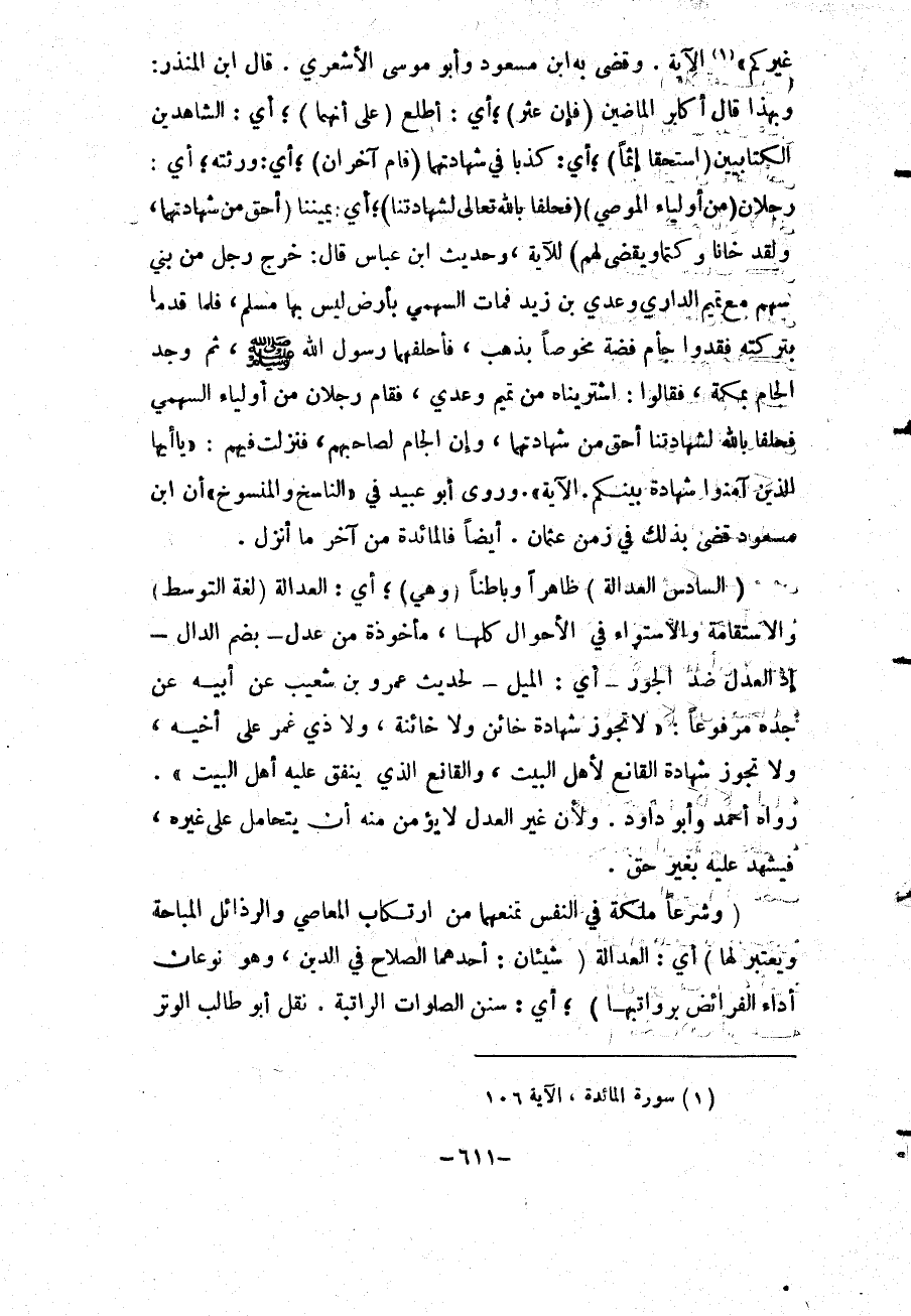 {يَا أَيُّهَا الَّذِينَ آمَنُوا شَهَادَةُ بَيْنِكُمْ إِذَا حَضَرَ أَحَدَكُمُ الْمَوْتُ حِينَ الْوَصِيَّةِ اثْنَانِ ذَوَا عَدْلٍ مِنْكُمْ أَوْ آخَرَانِ مِنْ غَيْرِكُمْ} [المائدة: 106] الْآيَةَ وَقَضَى بِهِ ابْنُ مَسْعُودٍ وَأَبُو مُوسَى الْأَشْعَرِيُّ.