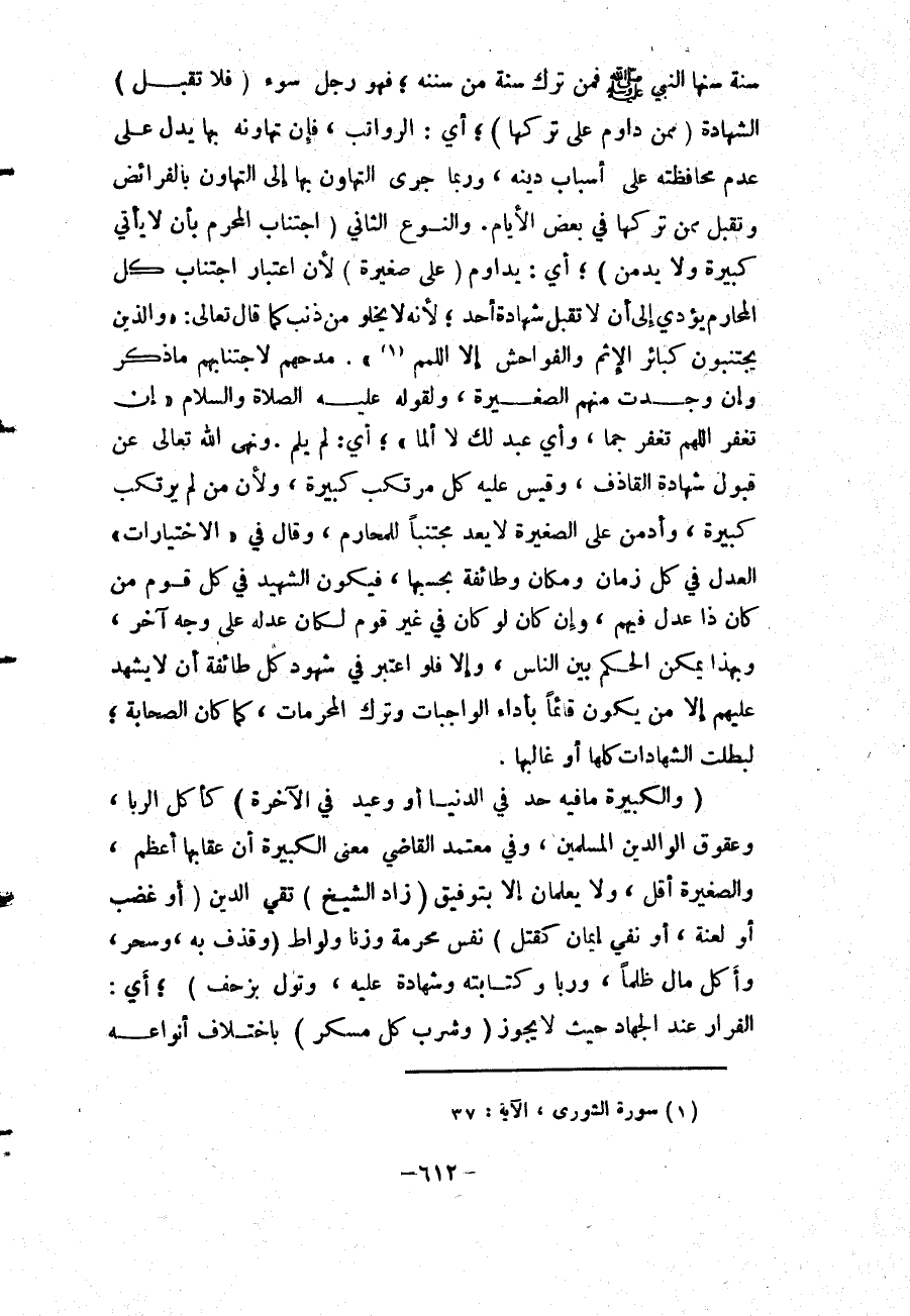 سُنَّةٌ سَنَّهَا النَّبِيُّ - صَلَّى اللَّهُ عَلَيْهِ وَسَلَّمَ - فَمَنْ تَرَكَ سُنَّةً مِنْ سُنَنِهِ، فَهُوَ رَجُلُ سُوءٍ (فَلَا تُقْبَلُ) الشَّهَادَةُ (مِمَّنْ دَاوَمَ عَلَى تَرْكِهَا) ؛ أَيْ: الرَّوَاتِبِ، فَإِنَّ تَهَاوُنَهُ بِهَا يَدُلُّ عَلَى عَدَمِ مُحَافَظَتِهِ عَلَى أَسْبَابِ دِينِهِ، وَرُبَّمَا جَرَى التَّهَاوُنُ بِهَا إلَى التَّهَاوُنِ بِالْفَرَائِضِ وَتُقْبَلُ مِمَّنْ تَرَكَهَا فِي بَعْضِ الْأَيَّامِ. وَالنَّوْعُ الثَّانِي (اجْتِنَابُ الْمُحَرَّمِ بِأَنْ لَا يَأْتِيَ كَبِيرَةً وَلَا يُدْمِنَ) ؛ أَيْ: يُدَاوِمَ (عَلَى صَغِيرَةٍ) لِأَنَّ اعْتِبَارَ اجْتِنَابِ كُلِّ الْمَحَارِمِ يُؤَدِّي إلَى أَنْ لَا تُقْبَلَ شَهَادَةُ أَحَدٍ؛ لِأَنَّهُ لَا يَخْلُو مِنْ ذَنْبٍ كَمَا قَالَ تَعَالَى: {الَّذِينَ يَجْتَنِبُونَ كَبَائِرَ الإِثْمِ وَالْفَوَاحِشَ إِلا اللَّمَمَ} [النجم: 32] .