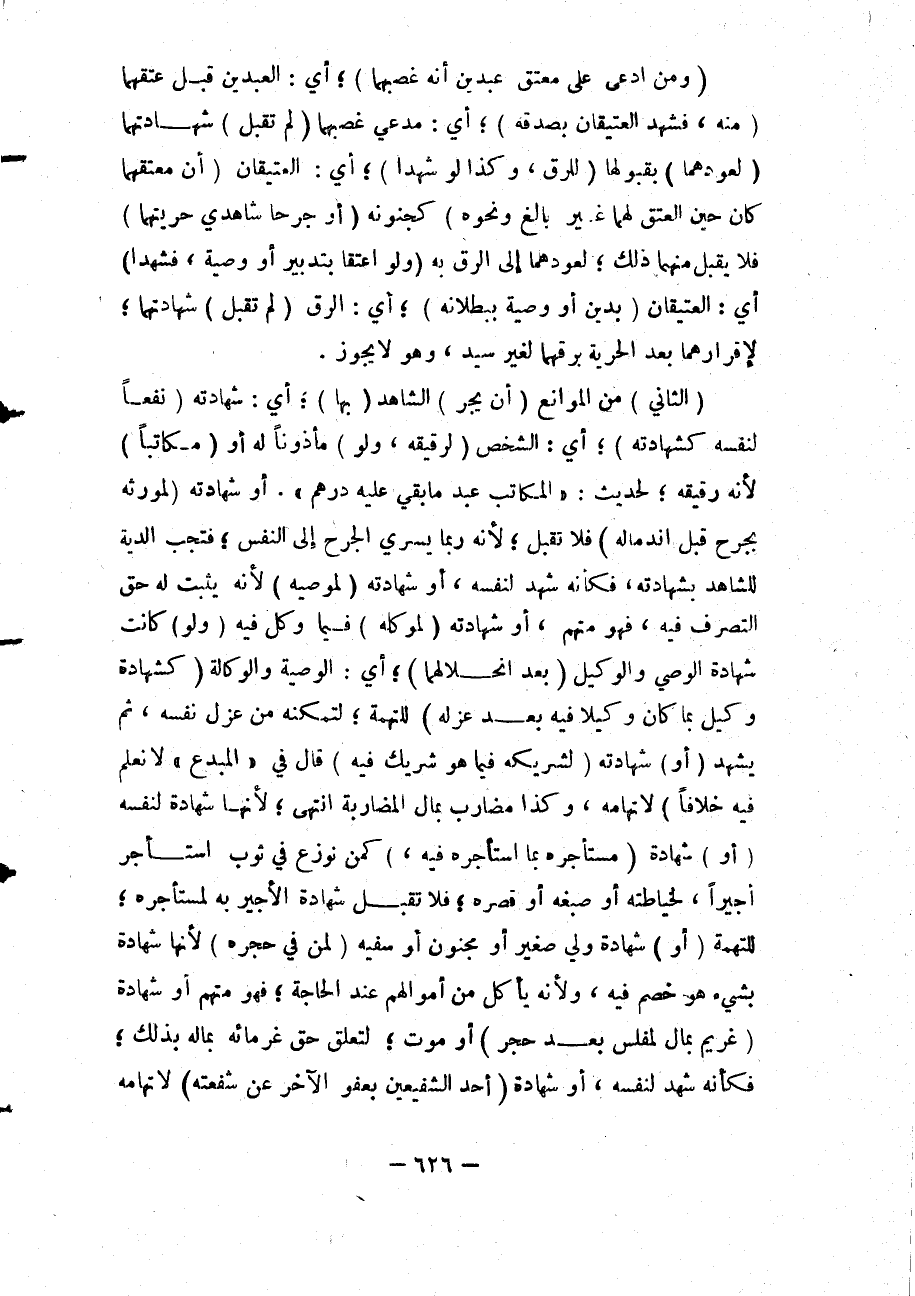 (الثَّانِي) مِنْ الْمَوَانِعِ (أَنْ يَجُرَّ) الشَّاهِدُ (بِهَا) ؛ أَيْ: شَهَادَتِهِ (نَفْعًا لِنَفْسِهِ كَشَهَادَتِهِ) ؛ أَيْ: الشَّخْصِ (لِرَقِيقِهِ، وَلَوْ) مَأْذُونًا لَهُ أَوْ (مُكَاتَبًا) لِأَنَّهُ رَقِيقُهُ؛ لِحَدِيثِ: «الْمُكَاتَبُ عَبْدٌ مَا بَقِيَ عَلَيْهِ دِرْهَمٌ» .