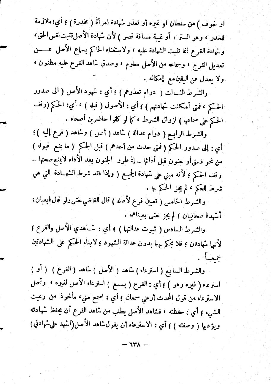وَالشَّرْطُ الرَّابِعُ (دَوَامُ عَدَالَةِ) شَاهِدِ (أَصْلٍ) وَشَاهِدِ (فَرْعٍ إلَيْهِ) ؛ أَيْ: إلَى صُدُورِ الْحُكْمِ (فَمَتَى حَدَثَ مِنْ أَحَدِهِمْ) قَبْلَ الْحُكْمِ (مَا يَمْنَعُ قَبُولَهُ) مِنْ نَحْوِ فِسْقٍ أَوْ جُنُونٍ قَبْلَ أَدَائِهَا - إذْ طُرُوُّ الْجُنُونِ بَعْدَ الْأَدَاءِ لَا يَمْنَعُ صِحَّتَهَا - وَقْفُ الْحُكْمِ؛ لِأَنَّهُ مَبْنِيٌّ عَلَى شَهَادَةِ الْجَمِيعِ (وَإِذَا فُقِدَ شَرْطُ الشَّهَادَةِ الَّتِي هِيَ شَرْطٌ لِلْحُكْمِ) ، لَمْ يَجُزْ الْحُكْمُ بِهَا.