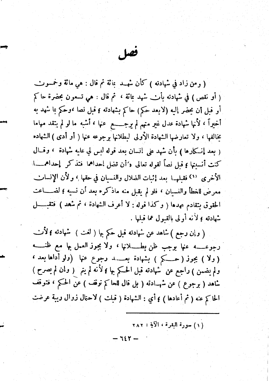 فَصْلٌ (وَمَنْ زَادَ فِي شَهَادَتِهِ) كَأَنْ شَهِدَ بِمِائَةٍ ثُمَّ قَالَ: هِيَ مِائَةٌ وَخَمْسُونَ (أَوْ نَقَصَ) فِي شَهَادَتِهِ بِأَنْ شَهِدَ بِمِائَةٍ، ثُمَّ قَالَ: هِيَ تِسْعُونَ بِحَضْرَةِ حَاكِمٍ أَوْ قَبْلَ أَنْ يَحْضُرَ إلَيْهِ (لَا بَعْدَ حُكْمِ) حَاكِمٍ بِشَهَادَتِهِ؛ قُبِلَ نَصًّا، وَحَكَمَ بِمَا شَهِدَ بِهِ أَخِيرًا، لِأَنَّهَا شَهَادَةُ عَدْلٍ غَيْرِ مُتَّهَمٍ لَمْ يَرْجِعْ عَنْهَا، أَشْبَهَ مَا لَوْ لَمْ يَتَقَدَّمْهَا مَا يُخَالِفُهَا، وَلَا تُعَارِضُهَا الشَّهَادَةُ الْأُولَى لِبُطْلَانِهَا بِرُجُوعِهِ عَنْهَا.