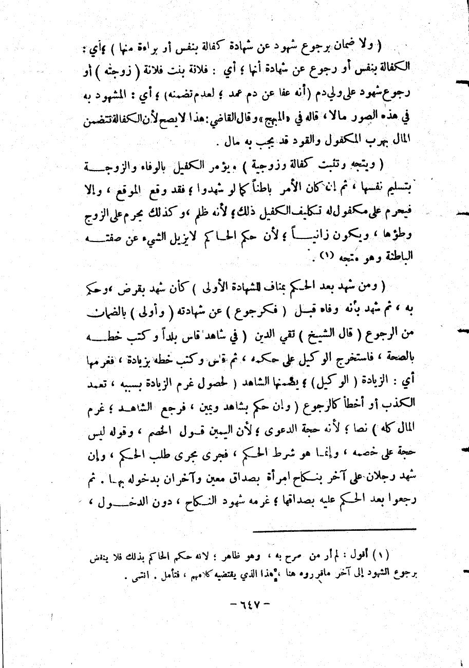 (وَلَا ضَمَانَ بِرُجُوعِ شُهُودٍ عَنْ شَهَادَةِ كَفَالَةٍ بِنَفْسٍ أَوْ بَرَاءَةٍ مِنْهَا) ؛ أَيْ: الْكَفَالَةِ بِنَفْسٍ أَوْ رُجُوعٍ عَنْ شَهَادَةٍ أَنَّهَا؛ أَيْ: فُلَانَةَ بِنْتَ فُلَانَةَ (زَوْجَتُهُ) أَوْ رُجُوعِ شُهُودٍ عَلَى وَلِيِّ دَمٍ (أَنَّهُ عَفَا عَنْ دَمٍ عَمْدٍ) ؛ لِعَدَمِ تَضَمُّنِهِ؛ أَيْ: الْمَشْهُودِ بِهِ فِي هَذِهِ الصُّوَرِ مَالًا، قَالَهُ فِي " الْمُبْهِجِ " وَقَالَ الْقَاضِي: هَذَا لَا يَصِحُّ لِأَنَّ الْكَفَالَةَ تَتَضَمَّنُ الْمَالَ بِهَرَبِ الْمَكْفُولِ وَالْقَوَدُ قَدْ يَجِبُ بِهِ مَالٌ