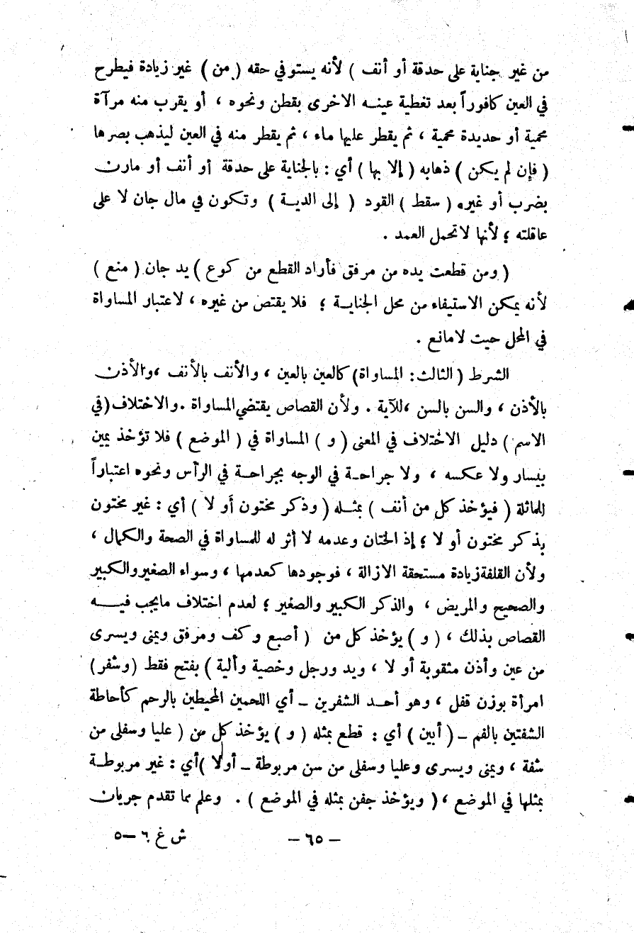 وَالِاخْتِلَافُ (فِي الِاسْمِ) دَلِيلُ الِاخْتِلَافِ فِي الْمَعْنَى (وَ) الْمُسَاوَاةُ فِي (الْمَوْضِعِ) فَلَا تُؤْخَذُ يَمِينٌ بِيَسَارٍ وَلَا عَكْسُهُ، وَلَا جِرَاحَةٌ فِي الْوَجْهِ بِجِرَاحَةٍ فِي الرَّأْسِ وَنَحْوِهِ اعْتِبَارًا لِلْمُمَاثَلَةِ (فَيُؤْخَذُ كُلٌّ مِنْ أَنْفٍ) بِمِثْلِهِ (وَذَكَرٍ مَخْتُونٍ أَوْ لَا) أَيْ: غَيْرِ مَخْتُونٍ بِذَكَرٍ مَخْتُونٍ أَوْ لَا؛ إذْ الْخِتَانُ وَعَدَمُهُ لَا أَثَرَ لَهُ لِلْمُسَاوَاةِ فِي الصِّحَّةِ وَالْكَمَالِ؛ وَلِأَنَّ الْقُلْفَةَ زِيَادَةٌ مُسْتَحِقَّةُ الْإِزَالَةِ، فَوُجُودُهَا كَعَدَمِهَا، وَسَوَاءٌ الصَّغِيرُ وَالْكَبِيرُ وَالصَّحِيحُ وَالْمَرِيضُ، وَالذَّكَرُ الْكَبِيرُ وَالصَّغِيرُ؛ لِعَدَمِ اخْتِلَافِ مَا يَجِبُ فِيهِ الْقِصَاصُ بِذَلِكَ، (وَ) يُؤْخَذُ كُلٌّ مِنْ (أُصْبُعٍ وَكَفٍّ وَمِرْفَقٍ وَيُمْنَى وَيُسْرَى مِنْ عَيْنٍ وَأُذُنٍ مَثْقُوبَةٍ أَوْ لَا، وَيَدٍ وَرِجْلٍ وَخُصْيَةٍ وَأَلْيَةٍ) بِفَتْحٍ فَقَطْ (وَشُفْرِ) امْرَأَةٍ بِوَزْنِ قُفْلٍ، وَهُوَ أَحَدُ الشُّفْرَيْنِ - أَيْ اللَّحْمَيْنِ الْمُحِيطَيْنِ بِالرَّحِمِ كَإِحَاطَةِ الشَّفَتَيْنِ بِالْفَمِ - (أُبِينَ) أَيْ: قُطِعَ بِمِثْلِهِ (وَ) يُؤْخَذُ كُلٌّ مِنْ (عُلْيَا وَسُفْلَى مِنْ شَفَةٍ، وَيُمْنَى وَيُسْرَى وَعُلْيَا وَسُفْلَى مِنْ سِنٍّ مَرْبُوطَةٍ - أَوْ لَا) أَيْ: غَيْرِ مَرْبُوطَةٍ بِمِثْلِهَا فِي الْمَوْضِعِ، (وَيُؤْخَذُ جَفْنٌ بِمِثْلِهِ فِي الْمَوْضِعِ) .
