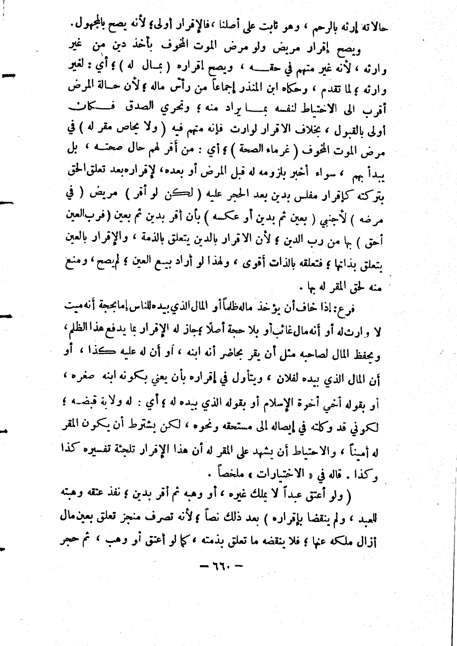 وَيَصِحُّ إقْرَارُ مَرِيضٍ وَلَوْ مَرَضَ الْمَوْتِ الْمَخُوفِ بِأَخْذِ دَيْنٍ مِنْ غَيْرِ وَارِثِهِ، لِأَنَّهُ غَيْرُ مُتَّهَمٍ فِي حَقِّهِ، وَيَصِحُّ إقْرَارُهُ (بِمَالٍ لَهُ) ؛ أَيْ: لِغَيْرِ وَارِثِهِ؛ لِمَا تَقَدَّمَ، وَحَكَاهُ ابْنُ الْمُنْذِرِ إجْمَاعًا مِنْ رَأْسِ مَالِهِ؛ لِأَنَّ حَالَةَ الْمَرَضِ أَقْرَبُ إلَى الِاحْتِيَاطِ لِنَفْسِهِ بِمَا يُرَادُ مِنْهُ؛ وَتَحَرِّي الصِّدْقِ فَكَانَ أَوْلَى بِالْقَبُولِ، بِخِلَافِ الْإِقْرَارِ لِوَارِثٍ فَإِنَّهُ مُتَّهَمٌ فِيهِ.