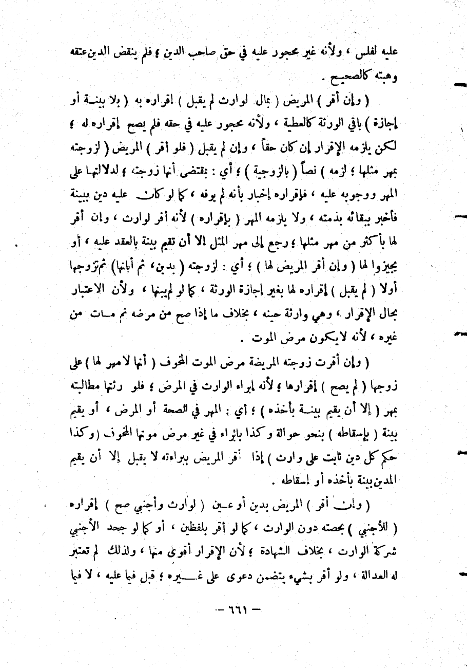 ' (وَإِنْ أَقَرَّتْ زَوْجَتُهُ الْمَرِيضَةُ) مَرَضَ الْمَوْتِ الْمَخُوفَ (أَنَّهَا لَا مَهْرَ لَهَا) عَلَى زَوْجِهَا (لَمْ يَصِحَّ) إقْرَارُهَا؛ لِأَنَّهُ إبْرَاءُ الْوَارِثِ فِي الْمَرَضِ؛ فَلِوَرَثَتِهَا مُطَالَبَتُهُ بِمَهْرٍ (إلَّا أَنْ يُقِيمَ بَيِّنَةً بِأَخْذِهِ) ؛ أَيْ: الْمَهْرَ فِي الصِّحَّةِ أَوْ الْمَرَضِ، أَوْ يُقِيمَ بَيِّنَةً (بِإِسْقَاطِهِ) بِنَحْوِ حَوَالَةٍ وَكَذَا بِإِبْرَاءٍ فِي غَيْرِ مَرَضِ مَوْتِهَا الْمَخُوفِ (وَكَذَا حُكْمُ كُلِّ دَيْنٍ ثَابِتٍ عَلَى وَارِثٍ) إذَا أَقَرَّ الْمَرِيضُ بِبَرَاءَتِهِ لَا يُقْبَلُ إلَّا أَنْ يُقِيمَ الْمَدِينُ بَيِّنَةً بِأَخْذِهِ أَوْ إسْقَاطِهِ.