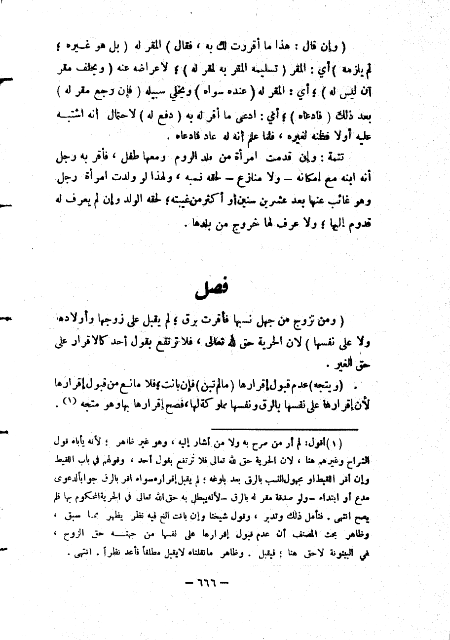 فَصْلٌ (وَمَنْ تَزَوَّجَ مَنْ جَهِلَ نَسَبَهَا فَأَقَرَّتْ بِرِقٍّ؛ لَمْ يُقْبَلْ عَلَى زَوْجِهَا وَأَوْلَادِهَا وَلَا عَلَى نَفْسِهَا) لِأَنَّ الْحُرِّيَّةَ حَقٌّ لِلَّهِ تَعَالَى، فَلَا تَرْتَفِعُ بِقَوْلِ أَحَدٍ كَالْإِقْرَارِ عَلَى حَقِّ الْغَيْرِ.