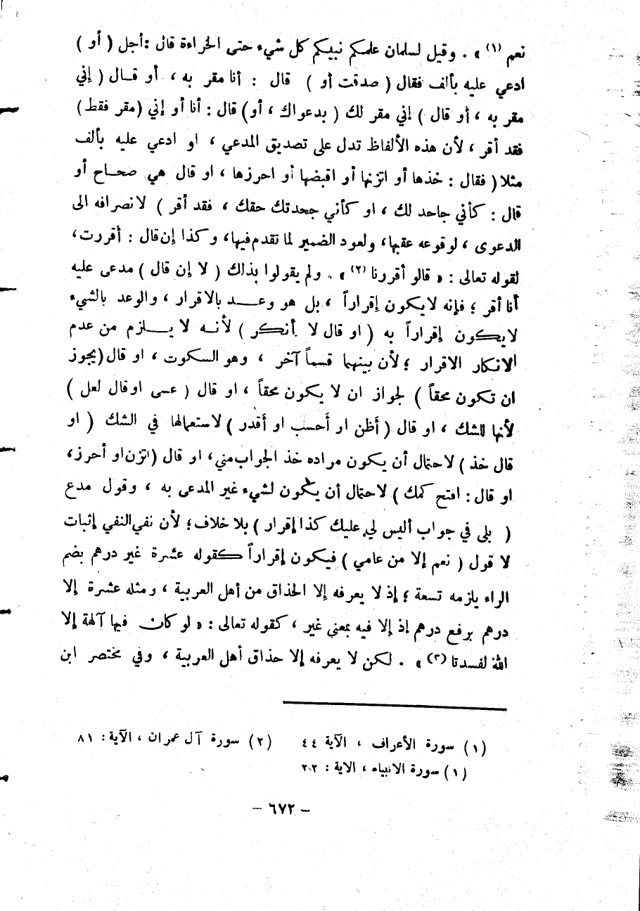 «وَقِيلَ لِسَلْمَانَ عَلَّمَكُمْ نَبِيُّكُمْ كُلَّ شَيْءٍ حَتَّى الْخِرَاءَةَ قَالَ: أَجَلْ» (أَوْ) ادَّعَى عَلَيْهِ بِأَلْفٍ فَقَالَ (صَدَقْت أَوْ) قَالَ: أَنَا مُقِرٌّ بِهِ، أَوْ قَالَ (إنِّي مُقِرٌّ بِهِ، أَوْ قَالَ) إنِّي مُقِرٌّ لَك (بِدَعْوَاك، أَوْ) قَالَ: أَنَا أَوْ إنِّي (مُقِرٌّ فَقَطْ) فَقَدْ أَقَرَّ، لِأَنَّ هَذِهِ الْأَلْفَاظَ تَدُلُّ عَلَى تَصْدِيقِ الْمُدَّعِي، أَوْ ادَّعَى عَلَيْهِ بِأَلْفٍ مَثَلًا (فَقَالَ: خُذْهَا أَوْ اتَّزِنْهَا أَوْ اقْبِضْهَا أَوْ اُحْرُزْهَا، أَوْ قَالَ هِيَ صِحَاحٌ أَوْ قَالَ: كَأَنِّي جَاحِدٌ لَك، أَوْ كَأَنِّي جَحَدْتُك حَقَّك، فَقَدْ أَقَرَّ) لِانْصِرَافِهِ إلَى الدَّعْوَى، لِوُقُوعِهِ عَقِبَهَا، وَلِعَوْدِ الضَّمِيرِ لِمَا تَقَدَّمَ فِيهَا، وَكَذَا إنْ قَالَ: أَقْرَرْتُ لِقَوْلِهِ تَعَالَى: {قَالُوا أَقْرَرْنَا} [آل عمران: 81] .