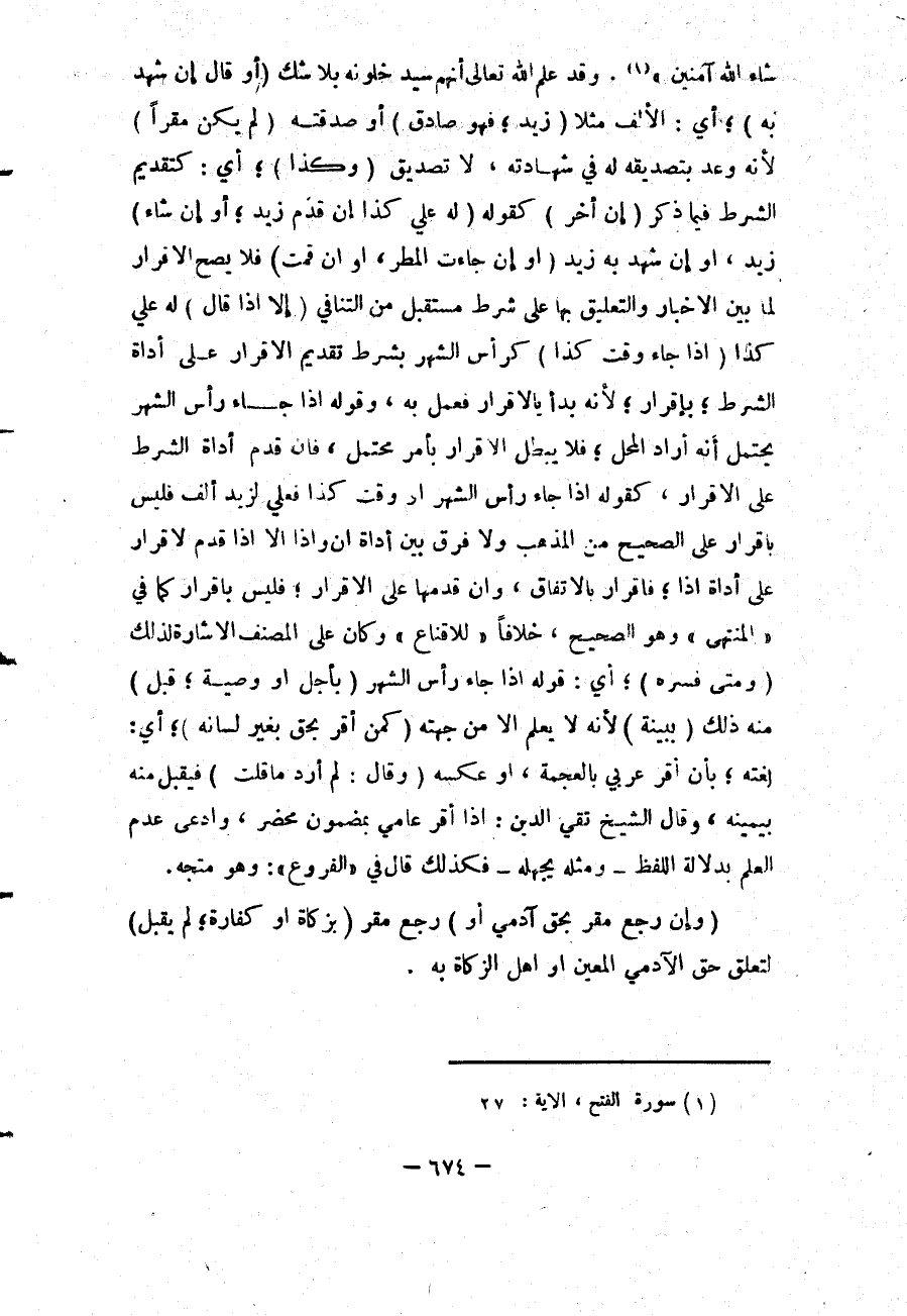 وَقَدْ عَلِمَ اللَّهُ تَعَالَى أَنَّهُمْ سَيَدْخُلُونَهُ بِلَا شَكٍّ (أَوْ قَالَ إنْ شَهِدَ بِهِ) ؛ أَيْ: الْأَلْفِ مَثَلًا (زَيْدٌ؛ فَهُوَ صَادِقٌ) أَوْ صَدَّقَتْهُ (لَمْ يَكُنْ مُقِرًّا) لِأَنَّهُ وَعَدَ بِتَصْدِيقِهِ لَهُ فِي شَهَادَتِهِ، لَا تَصْدِيقَ (وَكَذَا) ؛ أَيْ: كَتَقْدِيمِ الشَّرْطِ فِيمَا ذُكِرَ (إنْ أَخَّرَ) كَقَوْلِهِ (لَهُ عَلَيَّ كَذَا إنْ قَدِمَ زَيْدٌ؛ أَوْ إنْ شَاءَ) زَيْدٌ، أَوْ إنْ شَهِدَ بِهِ زَيْدٌ (أَوْ إنْ جَاءَتْ الْمَطَرُ، أَوْ إنْ قُمْت) فَلَا يَصِحُّ الْإِقْرَارُ لِمَا بَيْنَ الْإِخْبَارِ وَالتَّعْلِيقِ بِهَا عَلَى شَرْطٍ مُسْتَقْبَلٍ مِنْ التَّنَافِي (إلَّا إذَا قَالَ) لَهُ عَلَيَّ كَذَا (إذَا جَاءَ وَقْتُ كَذَا) كَرَأْسِ الشَّهْرِ بِشَرْطِ تَقْدِيمِ الْإِقْرَارِ عَلَى أَدَاةِ الشَّرْطِ؛ بِإِقْرَارٍ؛ لِأَنَّهُ بَدَأَ بِالْإِقْرَارِ فَعُمِلَ بِهِ، وَقَوْلُهُ إذَا جَاءَ رَأْسُ الشَّهْرِ يَحْتَمِلُ أَنَّهُ أَرَادَ الْمَحِلَّ؛ فَلَا يَبْطُلُ الْإِقْرَارُ بِأَمْرٍ مُحْتَمَلٍ، فَإِنْ قَدَّمَ أَدَاةَ الشَّرْطِ عَلَى الْإِقْرَارِ، كَقَوْلِهِ إذَا جَاءَ رَأْسُ الشَّهْرِ أَوْ وَقْتُ كَذَا فَعَلَيَّ لِزَيْدٍ أَلْفٌ فَلَيْسَ إقْرَارًا عَلَى الصَّحِيحِ مِنْ الْمَذْهَبِ وَلَا فَرْقَ بَيْنَ أَدَاةِ إنْ وَإِذَا إلَّا إذَا قُدِّمَ الْإِقْرَارُ عَلَى أَدَاةِ إذَا؛ فَإِقْرَارٌ بِالِاتِّفَاقِ، وَإِنْ قَدَّمَهَا عَلَى الْإِقْرَارِ؛ فَلَيْسَ بِإِقْرَارٍ كَمَا فِي الْمُنْتَهَى " وَهُوَ الصَّحِيحُ، خِلَافًا " لِلْإِقْنَاعِ " وَكَانَ عَلَى الْمُصَنِّفِ الْإِشَارَةُ لِذَلِكَ (وَمَتَى فَسَّرَهُ) ؛ أَيْ: قَوْلَهُ إذَا جَاءَ رَأْسُ الشَّهْرِ (بِأَجَلٍ أَوْ وَصِيَّةٍ؛ قُبِلَ) مِنْهُ ذَلِكَ (بِبَيِّنَةٍ) لِأَنَّهُ لَا يُعْلَمُ إلَّا مِنْ جِهَتِهِ (كَمَنْ أَقَرَّ بِحَقٍّ بِغَيْرِ لِسَانِهِ) ؛ أَيْ: لُغَتِهِ؛ بِأَنْ أَقَرَّ عَرَبِيٌّ بِالْعُجْمَةِ، أَوْ عَكْسُهُ (وَقَالَ: لَمْ أُرِدْ مَا قُلْت) فَيُقْبَلُ مِنْهُ بِيَمِينِهِ، وَقَالَ الشَّيْخُ تَقِيُّ الدِّينِ: إذَا أَقَرَّ عَامِّيٌّ بِمَضْمُونٍ مُحْضَرٍ، وَادَّعَى عَدَمَ الْعِلْمِ بِدَلَالَةِ اللَّفْظِ - وَمِثْلُهُ يَجْهَلُهُ فَكَذَلِكَ قَالَ فِي " الْفُرُوعِ ": وَهُوَ مُتَّجِهٌ.