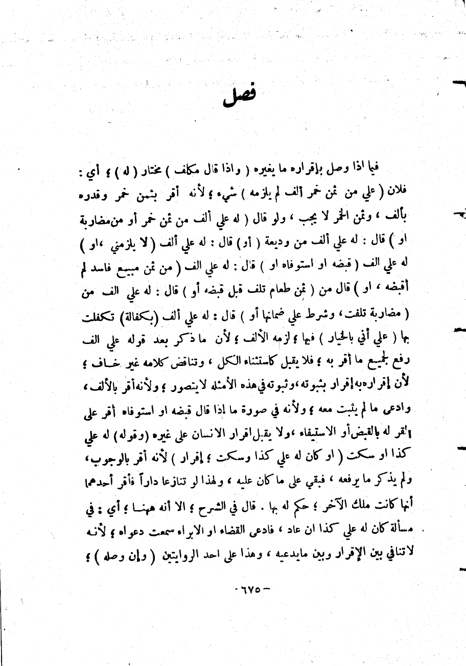 فَصْلٌ فِيمَا إذَا وَصَلَ بِإِقْرَارِهِ مَا يُغَيِّرُهُ (وَإِذَا قَالَ مُكَلَّفٌ) مُخْتَارٌ (لَهُ) ؛ أَيْ: فُلَانٍ (عَلَيَّ مِنْ ثَمَنِ خَمْرٍ أَلْفٌ لَمْ يَلْزَمْهُ) شَيْءٌ؛ لِأَنَّهُ أَقَرَّ بِثَمَنِ خَمْرٍ وَقَدَّرَهُ بِأَلْفٍ، وَثَمَنُ الْخَمْرِ لَا يَجِبُ، وَلَوْ قَالَ (لَهُ عَلَيَّ أَلْفٌ مِنْ ثَمَنِ خَمْرٍ أَوْ مِنْ مُضَارَبَةٍ أَوْ) قَالَ: لَهُ عَلَيَّ أَلْفٌ مِنْ وَدِيعَةٍ (أَوْ) قَالَ: لَهُ عَلَيَّ أَلْفٌ (لَا يَلْزَمُنِي، أَوْ) لَهُ عَلَيَّ أَلْفٌ (قَبَضَهُ أَوْ اسْتَوْفَاهُ أَوْ) قَالَ: لَهُ عَلَيَّ أَلْفٌ (مِنْ ثَمَنِ مَبِيعٍ فَاسِدٍ لَمْ أَقْبِضْهُ، أَوْ) قَالَ مِنْ (ثَمَنِ طَعَامٍ تَلِفَ قَبْلَ قَبْضِهِ أَوْ) قَالَ: لَهُ عَلَيَّ أَلْفٌ مِنْ (مُضَارَبَةٍ تَلِفَتْ، وَشَرَطَ عَلَيَّ ضَمَانَهَا أَوْ) قَالَ: لَهُ عَلَيَّ أَلْفٌ (بِكَفَالَةٍ) تَكَفَّلْت بِهَا (عَلَى أَنِّي بِالْخِيَارِ) فِيهَا؛ لَزِمَهُ الْأَلْفُ؛ لِأَنَّ مَا ذُكِرَ بَعْدَ قَوْلِهِ عَلَيَّ أَلْفٌ رَفْعٌ لِجَمِيعِ مَا أَقَرَّ بِهِ؛ فَلَا يُقْبَلُ كَاسْتِثْنَاءِ الْكُلِّ، وَتَنَاقُضُ كَلَامِهِ غَيْرُ خَافٍ؛ لِأَنَّ إقْرَارَهُ بِهِ إقْرَارٌ بِثُبُوتِهِ، وَثُبُوتُهُ فِي هَذِهِ الْأَمْثِلَةِ لَا يُتَصَوَّرُ؛ وَلِأَنَّهُ أَقَرَّ بِالْأَلْفِ، وَادَّعَى مَا لَمْ يَثْبُتْ مَعَهُ؛ وَلِأَنَّهُ فِي صُورَةِ مَا إذَا قَالَ قَبَضَهُ أَوْ اسْتَوْفَاهُ أَقَرَّ عَلَى الْمُقَرِّ لَهُ بِالْقَبْضِ أَوْ الِاسْتِيفَاءِ، وَلَا يُقْبَلُ إقْرَارُ الْإِنْسَانِ عَلَى غَيْرِهِ (وَقَوْلُهُ) لَهُ عَلَيَّ كَذَا أَوْ سَكَتَ (أَوْ كَانَ لَهُ عَلَيَّ كَذَا وَسَكَتَ؛ إقْرَارٌ) لِأَنَّهُ أَقَرَّ بِالْوُجُوبِ، وَلَمْ يَذْكُرْ مَا يَرْفَعُهُ، فَبَقِيَ عَلَى مَا كَانَ عَلَيْهِ، وَلِهَذَا لَوْ تَنَازَعَا دَارًا فَأَقَرَّ أَحَدُهُمَا أَنَّهَا كَانَتْ مِلْكَ الْآخَرِ؛ حُكِمَ لَهُ بِهَا.