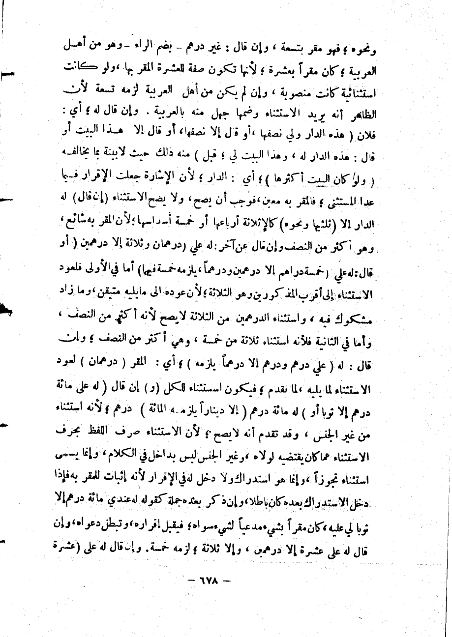 وَنَحْوَهُ؛ فَهُوَ مُقِرٌّ بِتِسْعَةٍ، وَإِنْ قَالَ: غَيْرُ دِرْهَمٍ - بِضَمِّ الرَّاءِ - وَهُوَ مِنْ أَهْلِ الْعَرَبِيَّةِ؛ كَانَ مُقِرًّا بِعَشَرَةٍ؛ لِأَنَّهَا تَكُونُ صِفَةً لِلْعَشَرَةِ الْمُقَرِّ بِهَا، وَلَوْ كَانَتْ اسْتِثْنَائِيَّةً كَانَتْ مَنْصُوبَةً، وَإِنْ لَمْ يَكُنْ مِنْ أَهْلِ الْعَرَبِيَّةِ لَزِمَهُ تِسْعَةٌ لِأَنَّ الظَّاهِرَ أَنَّهُ يُرِيدُ الِاسْتِثْنَاءَ وَضَمُّهَا جَهْلٌ مِنْهُ بِالْعَرَبِيَّةِ.
