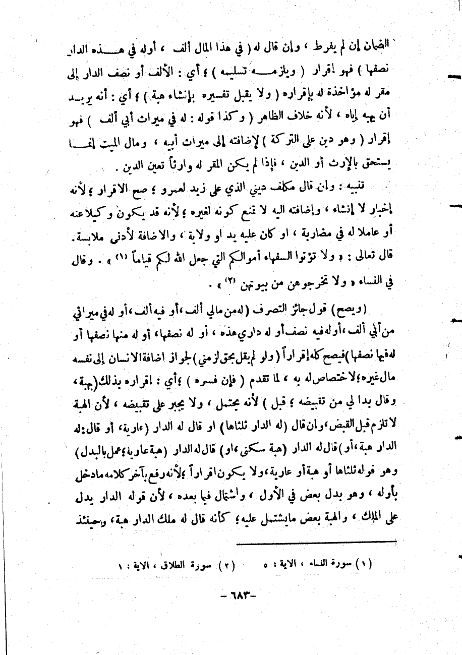 الضَّمَانِ إنْ لَمْ يُفَرِّطْ، وَإِنْ قَالَ لَهُ (فِي هَذَا الْمَالِ أَلْفٌ، أَوْ لَهُ فِي هَذِهِ الدَّارِ نِصْفُهَا) فَهُوَ إقْرَارٌ (وَيَلْزَمُهُ تَسْلِيمُهُ) ؛ أَيْ: الْأَلْفِ أَوْ نِصْفِ الدَّارِ إلَى مُقَرٍّ لَهُ مُؤَاخَذَةً لَهُ بِإِقْرَارِهِ (وَلَا يُقْبَلُ تَفْسِيرُهُ بِإِنْشَاءِ هِبَةٍ) أَيْ: أَنَّهُ يُرِيدُ أَنْ يَهَبَهُ إيَّاهُ، لِأَنَّهُ خِلَافُ الظَّاهِرِ (وَكَذَا قَوْلُهُ: لَهُ فِي مِيرَاثِ أَبِي أَلْفٌ) فَهُوَ إقْرَارٌ (وَهُوَ دَيْنٌ عَلَى التَّرِكَةِ) لِإِضَافَتِهِ إلَى مِيرَاثِ أَبِيهِ، وَمَالُ الْمَيِّتِ إنَّمَا يُسْتَحَقُّ بِالْإِرْثِ أَوْ الدَّيْنِ، فَإِذَا لَمْ يَكُنْ الْمُقَرُّ لَهُ وَارِثًا تَعَيَّنَ الدَّيْنُ.