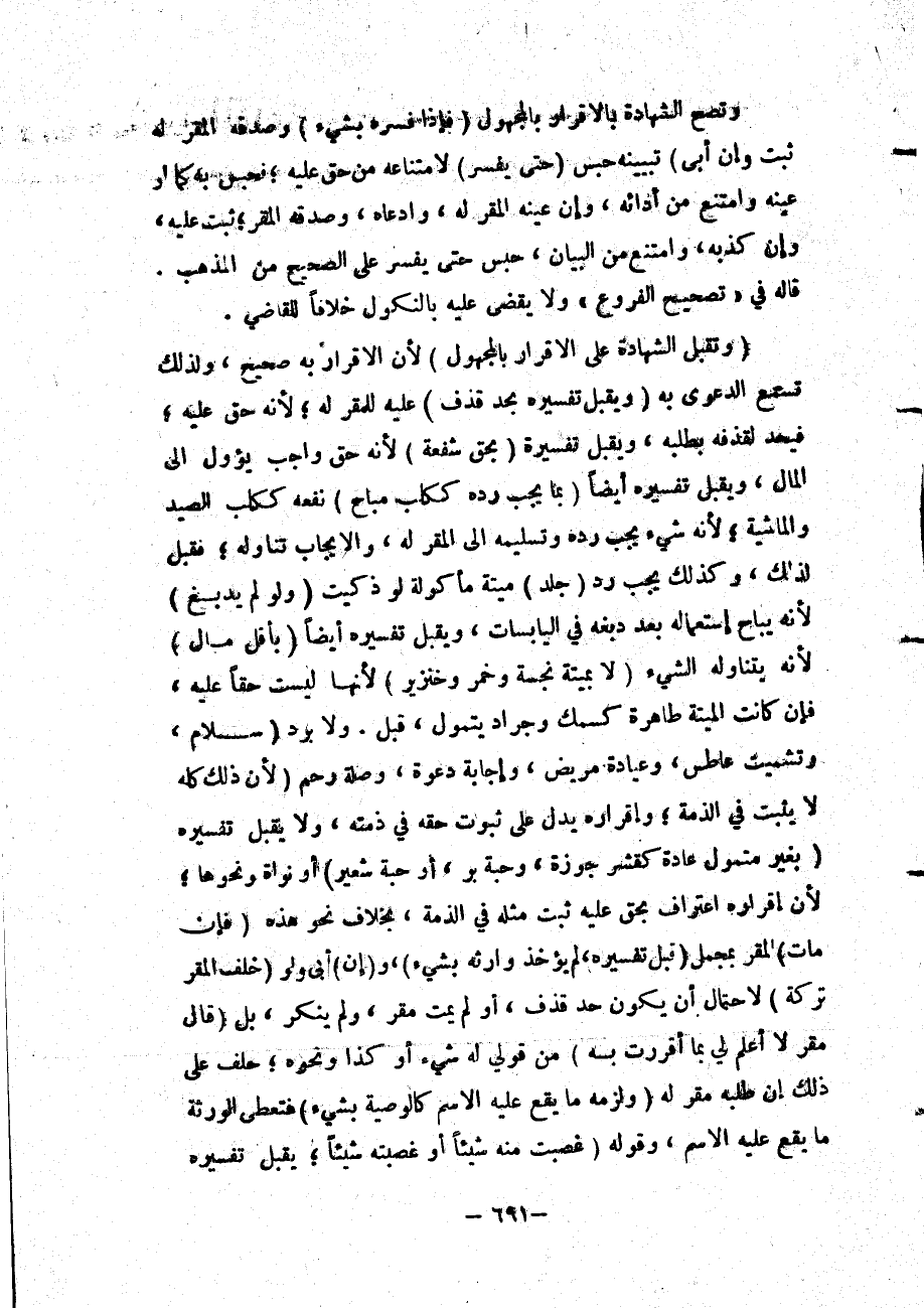 (وَتُقْبَلُ الشَّهَادَةُ عَلَى الْإِقْرَارِ بِالْمَجْهُولِ) لِأَنَّ الْإِقْرَارَ بِهِ صَحِيحٌ، وَلِذَلِكَ تُسْمَعُ الدَّعْوَى بِهِ (وَيُقْبَلُ تَفْسِيرُهُ بِحَدِّ قَذْفٍ) عَلَيْهِ لِلْمُقَرِّ لَهُ؛ لِأَنَّهُ حَقٌّ عَلَيْهِ؛ فَيُحَدُّ لِقَذْفِهِ بِطَلَبِهِ، وَيُقْبَلُ تَفْسِيرُهُ (بِحَقِّ شُفْعَةٍ) لِأَنَّهُ حَقٌّ وَاجِبٌ يَئُولَ إلَى الْمَالِ، وَيُقْبَلُ تَفْسِيرُهُ أَيْضًا (بِمَا يَجِبُ رَدُّهُ كَكَلْبٍ مُبَاحٍ) نَفْعُهُ كَكَلْبِ الصَّيْدِ وَالْمَاشِيَةِ؛ لِأَنَّهُ شَيْءٌ يَجِبُ رَدُّهُ وَتَسْلِيمُهُ إلَى الْمُقَرِّ لَهُ، وَالْإِيجَابُ تَنَاوَلَهُ؛ فَقُبِلَ لِذَلِكَ، وَكَذَلِكَ يَجِبُ رَدُّ (جِلْدِ) مَيْتَةٍ مَأْكُولَةٍ لَوْ ذُكِّيَتْ (وَلَوْ لَمْ يُدْبَغْ) لِأَنَّهُ يُبَاحُ اسْتِعْمَالُهُ بَعْدَ دَبْغِهِ فِي الْيَابِسَاتِ، وَيُقْبَلُ تَفْسِيرُهُ أَيْضًا (بِأَقَلِّ مَالٍ) لِأَنَّهُ يَتَنَاوَلُهُ الشَّيْءُ (لَا بِمَيْتَةٍ نَجِسَةٍ وَخَمْرٍ وَخِنْزِيرٍ) لِأَنَّهَا حَقًّا عَلَيْهِ، فَإِنْ كَانَتْ الْمَيْتَةُ طَاهِرَةً كَسَمَكٍ وَجَرَادٍ يُتَمَوَّلُ، قُبِلَ.