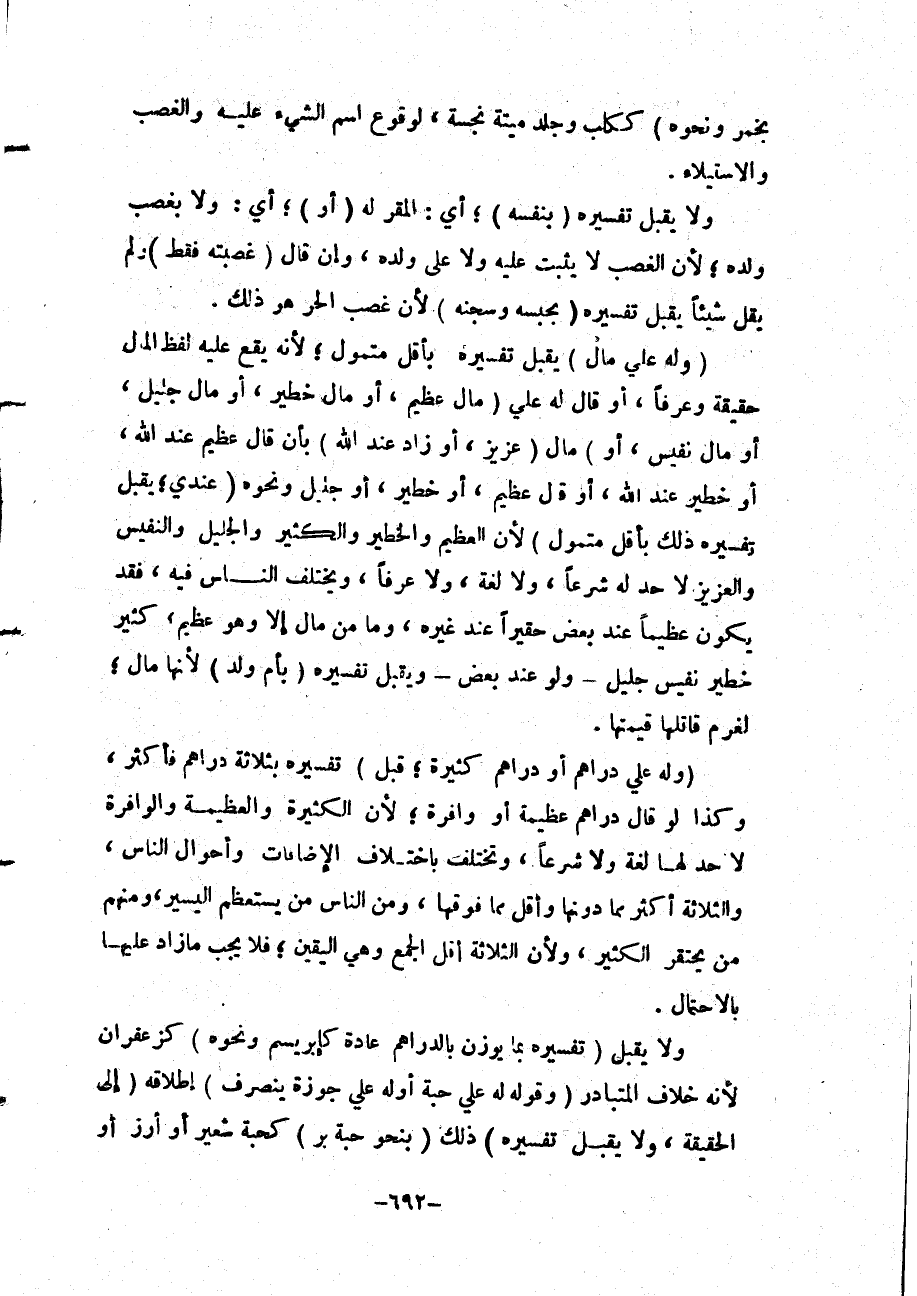 (وَلَهُ عَلَيَّ دَرَاهِمُ أَوْ دَرَاهِمُ كَثِيرَةٌ؛ قُبِلَ) تَفْسِيرُهُ بِثَلَاثَةِ دَرَاهِمَ فَأَكْثَرَ، وَكَذَا لَوْ قَالَ دَرَاهِمُ عَظِيمَةٌ أَوْ وَافِرَةٌ؛ لِأَنَّ الْكَثِيرَةَ وَالْعَظِيمَةَ وَالْوَافِرَةَ لَا حَدَّ لَهَا لُغَةً وَلَا شَرْعًا، وَتَخْتَلِفُ بِاخْتِلَافِ الْإِضَافَاتِ وَأَحْوَالِ النَّاسِ، وَالثَّلَاثَةُ أَكْثَرُ مِمَّا دُونَهَا وَأَقَلُّ مِمَّا فَوْقَهَا، وَمِنْ النَّاسِ مَنْ يَسْتَعْظِمُ الْيَسِيرَ، وَمِنْهُمْ مَنْ يَحْتَقِرُ الْكَثِيرَ، وَلِأَنَّ الثَّلَاثَةَ أَقَلُّ الْجَمْعِ وَهِيَ الْيَقِينُ؛ فَلَا يَجِبُ مَا زَادَ عَلَيْهَا بِالِاحْتِمَالِ.