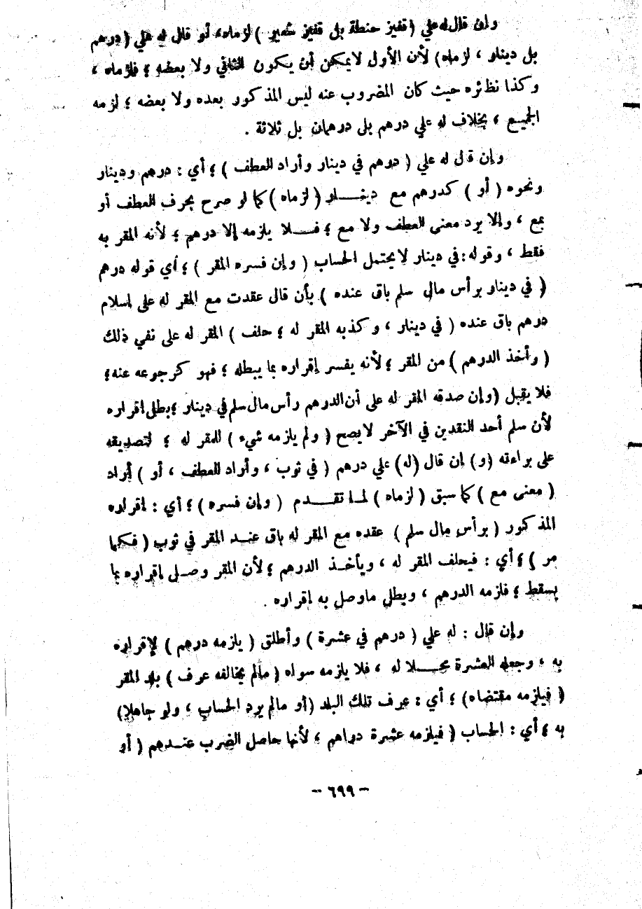 وَإِنْ قَالَ لَهُ عَلَيَّ (دِرْهَمٌ فِي دِينَارٍ وَأَرَادَ الْعَطْفَ) ؛ أَيْ: دِرْهَمٌ وَدِينَارٌ وَنَحْوُهُ (أَوْ) كَدِرْهَمٍ مَعَ دِينَارٍ (لَزِمَاهُ) كَمَا لَوْ صَرَّحَ بِحَرْفِ الْعَطْفِ أَوْ بِمَعَ، وَإِلَّا يُرِدْ مَعْنَى الْعَطْفِ وَلَا مَعَ؛ فَلَا يَلْزَمُهُ إلَّا دِرْهَمٌ؛ لِأَنَّهُ الْمُقَرُّ بِهِ فَقَطْ، وَقَوْلُهُ: فِي دِينَارٍ لَا يَحْتَمِلُ الْحِسَابَ (وَإِنْ فَسَّرَهُ الْمُقِرُّ) ؛ أَيْ قَوْلَهُ دِرْهَمٌ (فِي دِينَارٍ بِرَأْسِ مَالٍ سَلَّمَ بَاقٍ عِنْدَهُ) بِأَنْ قَالَ عَقَدْت مَعَ الْمُقَرِّ لَهُ عَلَى إسْلَامِ دِرْهَمٍ بَاقٍ عِنْدَهُ (فِي دِينَارٍ، وَكَذَّبَهُ الْمُقَرُّ لَهُ؛ حَلَفَ) الْمُقَرُّ لَهُ عَلَى نَفْيِ ذَلِكَ (وَأَخَذَ الدِّرْهَمَ) مِنْ الْمُقِرِّ؛ لِأَنَّهُ يُفَسِّرُ إقْرَارَهُ بِمَا يُبْطِلُهُ؛ فَهُوَ كَرُجُوعِهِ عَنْهُ؛ فَلَا يُقْبَلُ (وَإِنْ صَدَّقَهُ الْمُقَرُّ لَهُ عَلَى أَنْ الدِّرْهَمَ رَأْسُ مَالِ سَلَمٍ فِي دِينَارٍ) ؛ بَطَل إقْرَارُهُ لِأَنَّ سَلَمَ أَحَدِ النَّقْدَيْنِ فِي الْآخَرِ لَا يَصِحُّ (وَلَمْ يَلْزَمْهُ شَيْءٌ) لِلْمُقَرِّ لَهُ؛ لِتَصْدِيقِهِ عَلَى بَرَاءَتِهِ.