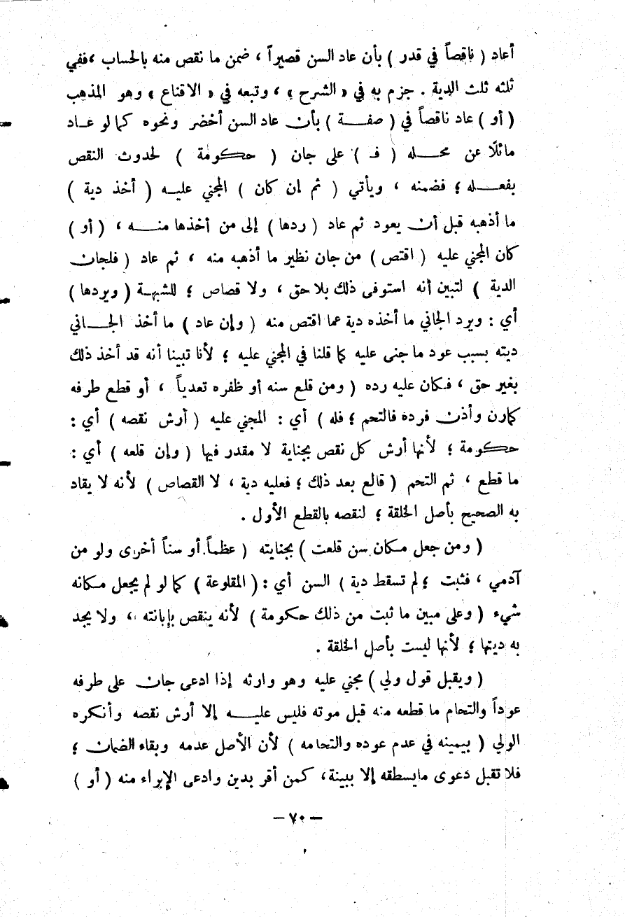 (أَوْ) عَادَ نَاقِصًا فِي (صِفَةٍ) بِأَنْ عَادَ السِّنُّ أَخْضَرَ وَنَحْوُهُ كَمَا لَوْ عَادَ مَائِلًا عَنْ مَحَلِّهِ (فَ) عَلَى جَانٍ (حُكُومَةٌ) لِحُدُوثِ النَّقْصِ بِفِعْلِهِ؛ فَضَمِنَهُ، وَيَأْتِي (ثُمَّ إنْ كَانَ) الْمَجْنِيُّ عَلَيْهِ (أَخَذَ دِيَةَ) مَا أَذْهَبَهُ قَبْلَ أَنْ يَعُودَ ثُمَّ عَادَ (رَدَّهَا) إلَى مَنْ أَخَذَهَا مِنْهُ، (أَوْ) كَانَ الْمَجْنِيُّ عَلَيْهِ (اقْتَصَّ) مِنْ جَانٍ نَظِيرَ مَا أَذْهَبَهُ مِنْهُ، ثُمَّ عَادَ (فَلِجَانٍ الدِّيَةُ) ؛ لِتَبَيُّنِ أَنَّهُ اسْتَوْفَى ذَلِكَ بِلَا حَقٍّ، وَلَا قِصَاصٍ؛ لِلشُّبْهَةِ (وَيَرُدُّهَا) أَيْ: وَيَرُدُّ الْجَانِي مَا أَخَذَهُ دِيَةً عَمَّا اقْتَصَّ مِنْهُ (وَإِنْ عَادَ) مَا أَخَذَ الْجَانِي دِيَتَهُ بِسَبَبِ عَوْدِ مَا جُنِيَ عَلَيْهِ كَمَا قُلْنَا فِي الْمَجْنِيِّ عَلَيْهِ؛ لِأَنَّا تَبَيَّنَّا أَنَّهُ قَدْ أَخَذَ ذَلِكَ بِغَيْرِ حَقٍّ، فَكَانَ عَلَيْهِ رَدُّهُ (وَمَنْ قَلَعَ سِنَّهُ أَوْ ظُفُرَهُ تَعَدِّيًا، أَوْ قَطَعَ طَرَفَهُ كَمَارِنٍ وَأُذُنٍ فَرَدَّهُ فَالْتَحَمَ؛ فَلَهُ) أَيْ: الْمَجْنِيِّ عَلَيْهِ (أَرْشُ نَقْصِهِ) أَيْ: حُكُومَةٌ؛ لِأَنَّهَا أَرْشُ كُلِّ نَقْصٍ بِجِنَايَةٍ لَا مُقَدَّرَ فِيهَا (وَإِنْ قَلَعَهُ) أَيْ: مَا قُطِعَ، ثُمَّ الْتَحَمَ (قَالِعٌ بَعْدَ ذَلِكَ؛ فَعَلَيْهِ دِيَةٌ، لَا الْقِصَاصُ) ؛ لِأَنَّهُ لَا يُقَادُ بِهِ الصَّحِيحُ بِأَصْلِ الْخِلْقَةِ؛ لِنَقْصِهِ بِالْقَطْعِ الْأَوَّلِ.