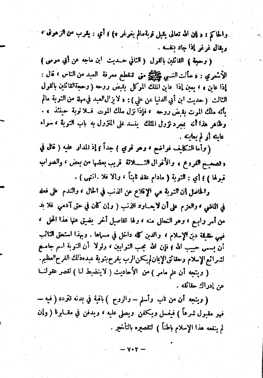 (وَحُجَّةُ) الْقَائِلِينَ بِالْقَوْلِ (الثَّانِي حَدِيثُ ابْنِ مَاجَهْ عَنْ أَبِي مُوسَى) الْأَشْعَرِيِّ: «سَأَلَتْ النَّبِيَّ - صَلَّى اللَّهُ عَلَيْهِ وَسَلَّمَ - مَتَى تَنْقَطِعُ مَعْرِفَةُ الْعَبْدِ مِنْ النَّاسِ، قَالَ: إذَا عَايَنَ» ، يُعَيِّنُ إذَا عَايَنَ الْمَلَكَ الْمُوَكَّلَ بِقَبْضِ رُوحِهِ (وَحُجَّةُ الْقَائِلِينَ) بِالْقَوْلِ الثَّالِثِ (حَدِيثُ ابْنِ أَبِي الدُّنْيَا عَنْ عَلِيٍّ) : «لَا يَزَالُ الْعَبْدُ فِي مُهْلَةٍ مِنْ التَّوْبَةِ مَا لَمْ يَأْتِهِ مَلَكُ الْمَوْتِ بِقَبْضِ رُوحِهِ، فَإِذَا نَزَلَ مَلَكُ الْمَوْتِ فَلَا تَوْبَةَ حِينَئِذٍ» .