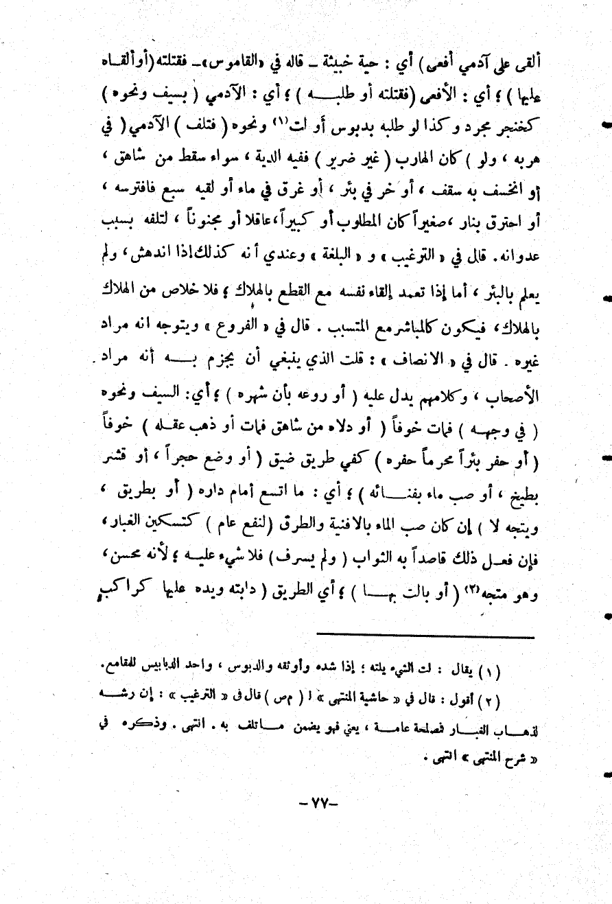 قَالَ فِي " الْفُرُوعِ ": وَيَتَوَجَّهُ أَنَّهُ مُرَادُ غَيْرِهِ. قَالَ فِي " الْإِنْصَافِ ": قُلْت: الَّذِي يَنْبَغِي أَنْ يُجْزَمَ بِهِ أَنَّهُ مُرَادُ الْأَصْحَابِ، وَكَلَامُهُمْ يَدُلُّ عَلَيْهِ (أَوْ رَوَّعَهُ بِأَنْ شَهَرَهُ) ؛ أَيْ: السَّيْفَ وَنَحْوَهُ (فِي وَجْهِهِ) فَمَاتَ خَوْفًا (أَوْ دَلَّاهُ مِنْ شَاهِقٍ فَمَاتَ أَوْ ذَهَبَ عَقْلُهُ) خَوْفًا (أَوْ حَفَرَ بِئْرًا مُحَرَّمًا حَفْرُهُ) كَفِي طَرِيقٍ ضَيِّقٍ (أَوْ وَضَعَ حَجَرًا، أَوْ قِشْرَ بِطِّيخٍ، أَوْ صَبَّ مَاءً بِفِنَائِهِ) ؛ أَيْ: مَا اتَّسَعَ أَمَامَ دَارِهِ (أَوْ بِطَرِيقٍ، وَيَتَّجِهُ لَا) إنْ كَانَ صَبُّ الْمَاءِ بِالْأَفْنِيَةِ وَالطُّرُقِ (لِنَفْعٍ عَامٍّ) كَتَسْكِينِ الْغُبَارِ، فَإِنْ فَعَلَ ذَلِكَ قَاصِدًا بِهِ الثَّوَابَ (وَلَمْ يُسْرِفْ) فَلَا شَيْءَ عَلَيْهِ؛ لِأَنَّهُ مُحْسِنٌ، وَهُوَ مُتَّجِهٌ (أَوْ بِاَلَّتِي بِهَا) ؛ أَيْ الطَّرِيقِ (دَابَّتُهُ وَيَدُهُ عَلَيْهَا كَرَاكِبٍ