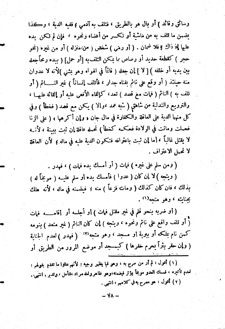 وَسَائِقٍ وَقَائِدٍ) أَوْ بَالَ هُوَ بِالطَّرِيقِ، فَتَلِفَ بِهِ آدَمِيٌّ؛ فَفِيهِ الدِّيَةُ، وَكَذَا يَضْمَنُ مَا تَلِفَ بِهِ مِنْ مَاشِيَةٍ أَوْ تَكَسَّرَ مِنْ أَعْضَاءٍ وَنَحْوِهِ، فَإِنْ لَمْ تَكُنْ يَدُهُ عَلَيْهَا إذْ ذَاكَ؛ فَلَا ضَمَانَ.