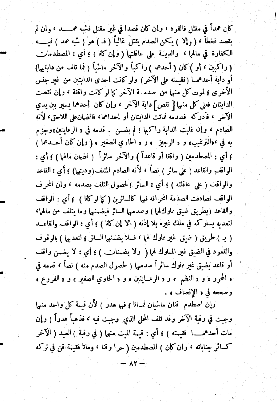 كَانَ عَمْدًا فِي مَقْتَلٍ فَالْقَوَدُ، وَإِنْ كَانَ قَصْدًا فِي غَيْرِ مَقْتَلٍ فَشِبْهُ عَمْدٍ، وَإِنْ لَمْ يَقْصِدْ فَخَطَأٌ، (وَإِلَّا) يَكُنْ الصَّدْمُ يَقْتُلُ غَالِبًا (فَ) هُوَ (شِبْهُ عَمْدٍ) فِيهِ الْكَفَّارَةُ فِي مَالِهِمَا، وَالدِّيَةُ عَلَى عَاقِلَتِهِمَا (وَإِنْ كَانَا) ؛ أَيْ: الْمُصْطَدِمَانِ (رَاكِبَيْنِ، أَوْ) كَانَ (أَحَدُهُمَا) رَاكِبًا وَالْآخَرُ مَاشِيًا (فَمَا تَلِفَ مِنْ دَابَّتَيْهِمَا) أَوْ دَابَّةِ أَحَدِهِمَا (فَقِيمَتُهُ عَلَى الْآخَرِ) وَلَوْ كَانَتْ إحْدَى الدَّابَّتَيْنِ مِنْ غَيْرِ جِنْسِ الْأُخْرَى؛ لِمَوْتِ كُلٍّ مِنْهُمَا مِنْ صَدْمَةِ الْآخَرِ كَمَا لَوْ كَانَتْ وَاقِفَةً، وَإِنْ نَقَصَتْ الدَّابَّتَانِ فَعَلَى كُلٍّ مِنْهُمَا [نَقْصُ] دَابَّةِ الْآخَرِ، وَإِنْ كَانَ أَحَدُهُمَا يَسِيرُ بَيْنَ يَدَيْ الْآخَرِ، فَأَدْرَكَهُ فَصَدَمَهُ فَمَاتَتْ الدَّابَّتَانِ أَوْ إحْدَاهُمَا، فَالضَّمَانُ عَلَى اللَّاحِقِ؛ لِأَنَّهُ الصَّادِمُ، وَإِنْ غَلَبَتْ الدَّابَّةُ رَاكِبَهَا؛ لَمْ يَضْمَنْ. قَدَّمَهُ فِي " الرِّعَايَتَيْنِ " وَجَزَمَ بِهِ فِي، " التَّرْغِيبِ " وَ " الْوَجِيزِ " وَ " الْحَاوِي الصَّغِيرِ.