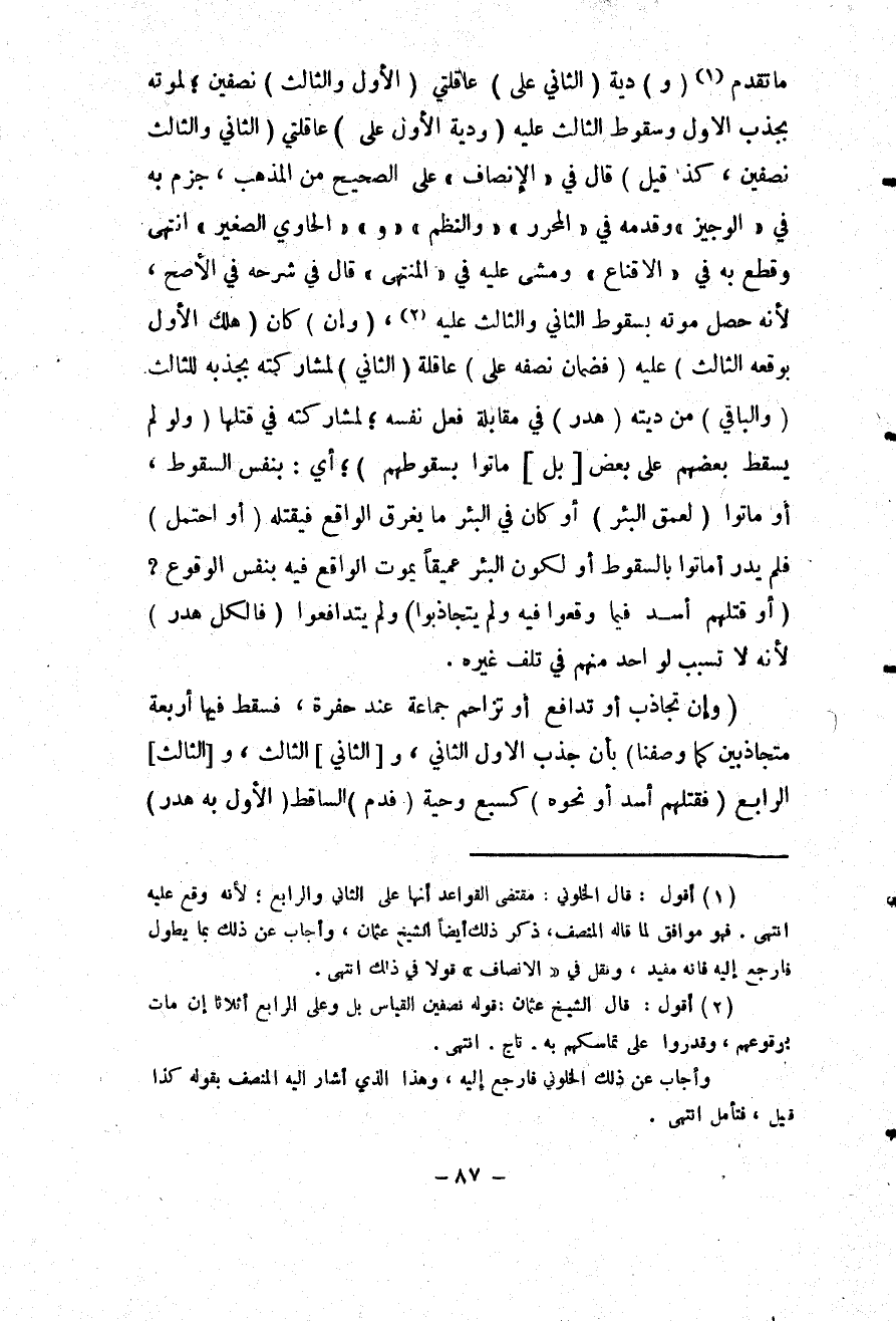 وَقَطَعَ بِهِ فِي " الْإِقْنَاعِ " وَمَشَى عَلَيْهِ فِي الْمُنْتَهَى " قَالَ فِي شَرْحِهِ فِي الْأَصَحِّ: لِأَنَّهُ حَصَلَ مَوْتُهُ بِسُقُوطِ الثَّانِي وَالثَّالِثِ عَلَيْهِ، (وَإِنْ) كَانَ (هَلَكَ الْأَوَّلُ بِوَقْعَةِ الثَّالِثِ) عَلَيْهِ (فَضَمَانُ نِصْفِهِ عَلَى) عَاقِلَةِ (الثَّانِي) لِمُشَارَكَتِهِ بِجَذْبِهِ لِلثَّالِثِ (وَالْبَاقِي) مِنْ دِيَتِهِ (هَدَرٌ) فِي مُقَابَلَةِ فِعْلِ نَفْسِهِ؛ لِمُشَارَكَتِهِ فِي قَتْلِهَا (وَلَوْ لَمْ يَسْقُطْ بَعْضُهُمْ عَلَى بَعْضٍ [بَلْ] مَاتُوا بِسُقُوطِهِمْ) ؛ أَيْ: بِنَفْسِ السُّقُوطِ، أَوْ مَاتُوا (لِعُمْقِ الْبِئْرِ) أَوْ كَانَ فِي الْبِئْرِ مَا يُغْرِقُ الْوَاقِعَ فَيَقْتُلُهُ (أَوْ اُحْتُمِلَ) فَلَمْ يُدْرَ أَمَاتُوا بِالسُّقُوطِ أَوْ لِكَوْنِ الْبِئْرِ عَمِيقًا يَمُوتُ الْوَاقِعُ فِيهِ بِنَفْسِ الْوُقُوعِ؟ (أَوْ قَتَلَهُمْ أَسَدٌ فِيمَا وَقَعُوا فِيهِ وَلَمْ يَتَجَاذَبُوا) وَلَمْ يَتَدَافَعُوا (فَالْكُلُّ هَدَرٌ) ؛ لِأَنَّهُ لَا تَسَبُّبَ لِوَاحِدٍ مِنْهُمْ فِي تَلَفِ غَيْرِهِ.