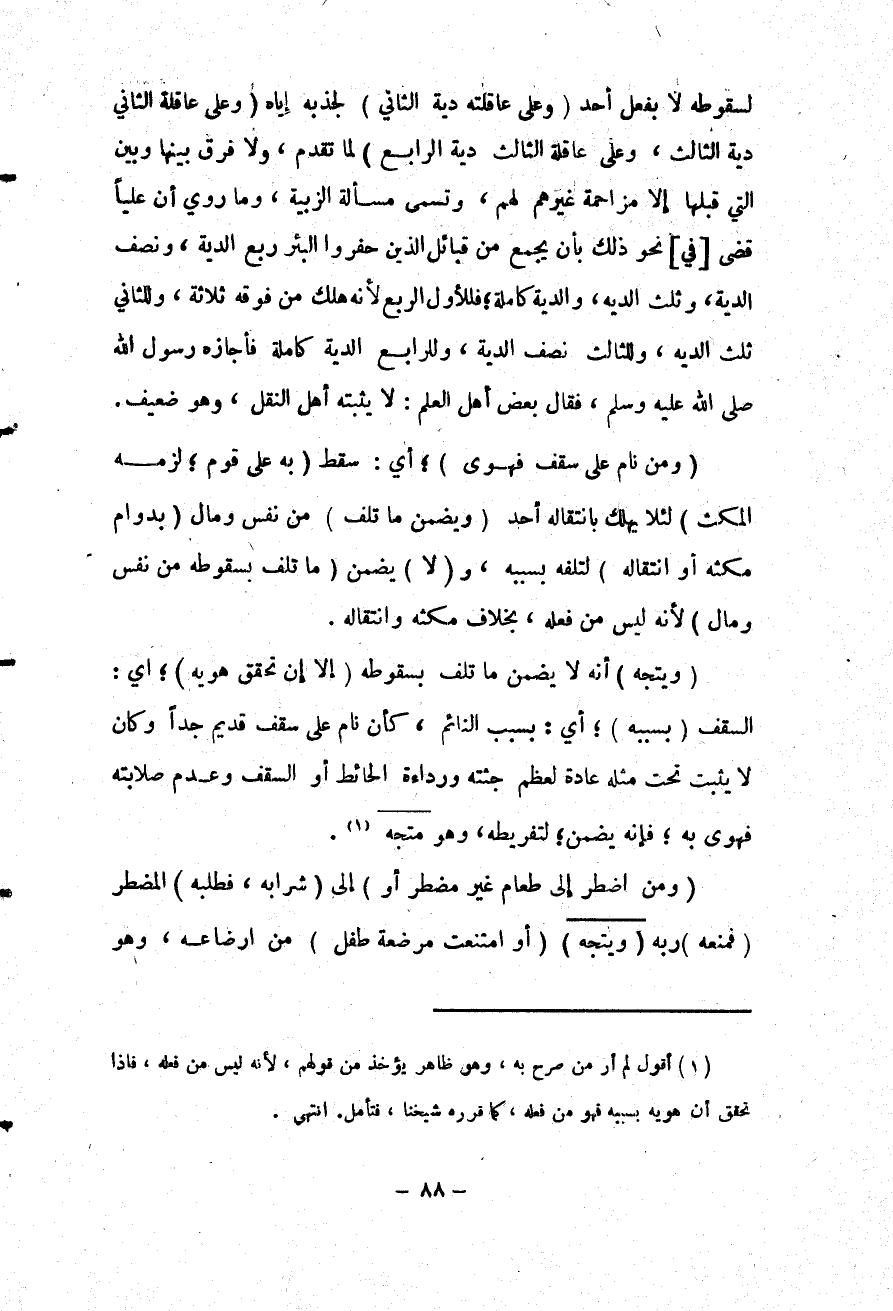 (وَيَتَّجِهُ) أَنَّهُ لَا يَضْمَنُ مَا تَلِفَ بِسُقُوطِهِ (إلَّا إنْ تَحَقَّقَ هَوِيُّهُ) ؛ أَيْ: السَّقْفِ (بِسَبَبِهِ) ؛ أَيْ: بِسَبَبِ النَّائِمِ، كَأَنْ نَامَ عَلَى سَقْفٍ قَدِيمٍ جِدًّا وَكَانَ لَا يَثْبُتُ تَحْتَ مِثْلِهِ عَادَةً لِعَظْمِ جُثَّتِهِ وَرَدَاءَةِ الْحَائِطِ أَوْ السَّقْفِ وَعَدَمِ صَلَابَتِهِ فَهَوَى بِهِ؛ فَإِنَّهُ يَضْمَنُ؛ لِتَفْرِيطِهِ، وَهُوَ مُتَّجِهٌ.