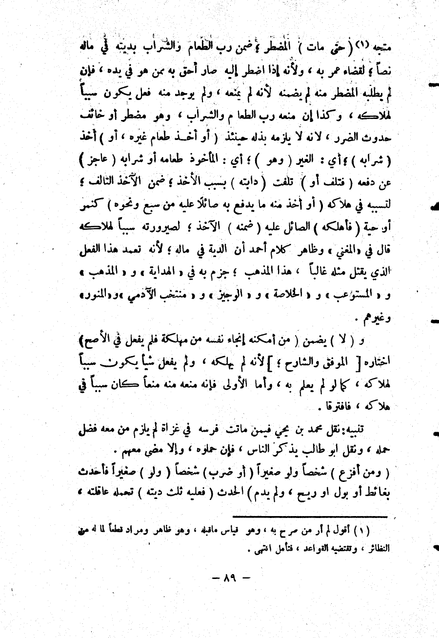مُتَّجِهٌ (حَتَّى مَاتَ) الْمُضْطَرُّ ضَمِنَ رَبُّ الطَّعَامِ وَالشَّرَابِ بِدِيَتِهِ فِي مَالِهِ نَصًّا؛ لِقَضَاءِ عُمَرَ بِهِ؛ وَلِأَنَّهُ إذَا اُضْطُرَّ إلَيْهِ صَارَ أَحَقَّ بِهِ مِمَّنْ هُوَ فِي يَدِهِ، فَإِنْ لَمْ يَطْلُبْهُ الْمُضْطَرُّ مِنْهُ لَمْ يَضْمَنْهُ؛ لِأَنَّهُ لَمْ يَمْنَعْهُ، وَلَمْ يُوجَدْ مِنْهُ فِعْلٌ يَكُونُ سَبَبًا لِهَلَاكِهِ، وَكَذَا إنْ مَنَعَهُ رَبُّ الطَّعَامِ وَالشَّرَابِ، وَهُوَ مُضْطَرٌّ أَوْ خَائِفٌ حُدُوثَ الضَّرَرِ؛ لِأَنَّهُ لَا يَلْزَمُهُ بَذْلُهُ حِينَئِذٍ (أَوْ أَخَذَ طَعَامَ غَيْرِهِ، أَوْ) أَخَذَ (شَرَابَهُ) ؛ أَيْ: الْغَيْرِ (وَهُوَ) ، أَيْ: الْمَأْخُوذُ طَعَامُهُ أَوْ شَرَابُهُ (عَاجِزٌ) عَنْ دَفْعِهِ (فَتَلِفَ أَوْ) تَلِفَتْ (دَابَّتُهُ) بِسَبَبِ الْأَخْذِ؛ ضَمِنَ الْآخِذُ التَّالِفَ؛ لِتَسَبُّبِهِ فِي هَلَاكِهِ (أَوْ أَخَذَ مِنْهُ مَا يَدْفَعُ بِهِ صَائِلًا عَلَيْهِ مِنْ سَبُعٍ وَنَحْوِهِ) كَنَمِرٍ أَوْ حَيَّةٍ (فَأَهْلَكَهُ) الصَّائِلُ عَلَيْهِ (ضَمِنَهُ) الْآخِذُ؛ لِصَيْرُورَتِهِ سَبَبًا لِهَلَاكِهِ قَالَ فِي " الْمُغْنِي " وَظَاهِرُ كَلَامِ أَحْمَدَ أَنَّ الدِّيَةَ فِي مَالِهِ؛ لِأَنَّهُ تَعَمَّدَ هَذَا الْفِعْلَ الَّذِي يَقْتُلُ مِثْلُهُ غَالِبًا، هَذَا الْمَذْهَبُ؛ جَزَمَ بِهِ فِي " الْهِدَايَةِ " وَ " الْمُذَهَّبِ " وَ " الْمُسْتَوْعِبِ " وَ " الْخُلَاصَةِ " وَ " الْوَجِيزِ " وَ " مُنْتَخَبِ الْآدَمِيِّ " وَ " الْمُنَوِّرِ " وَغَيْرِهِمْ.