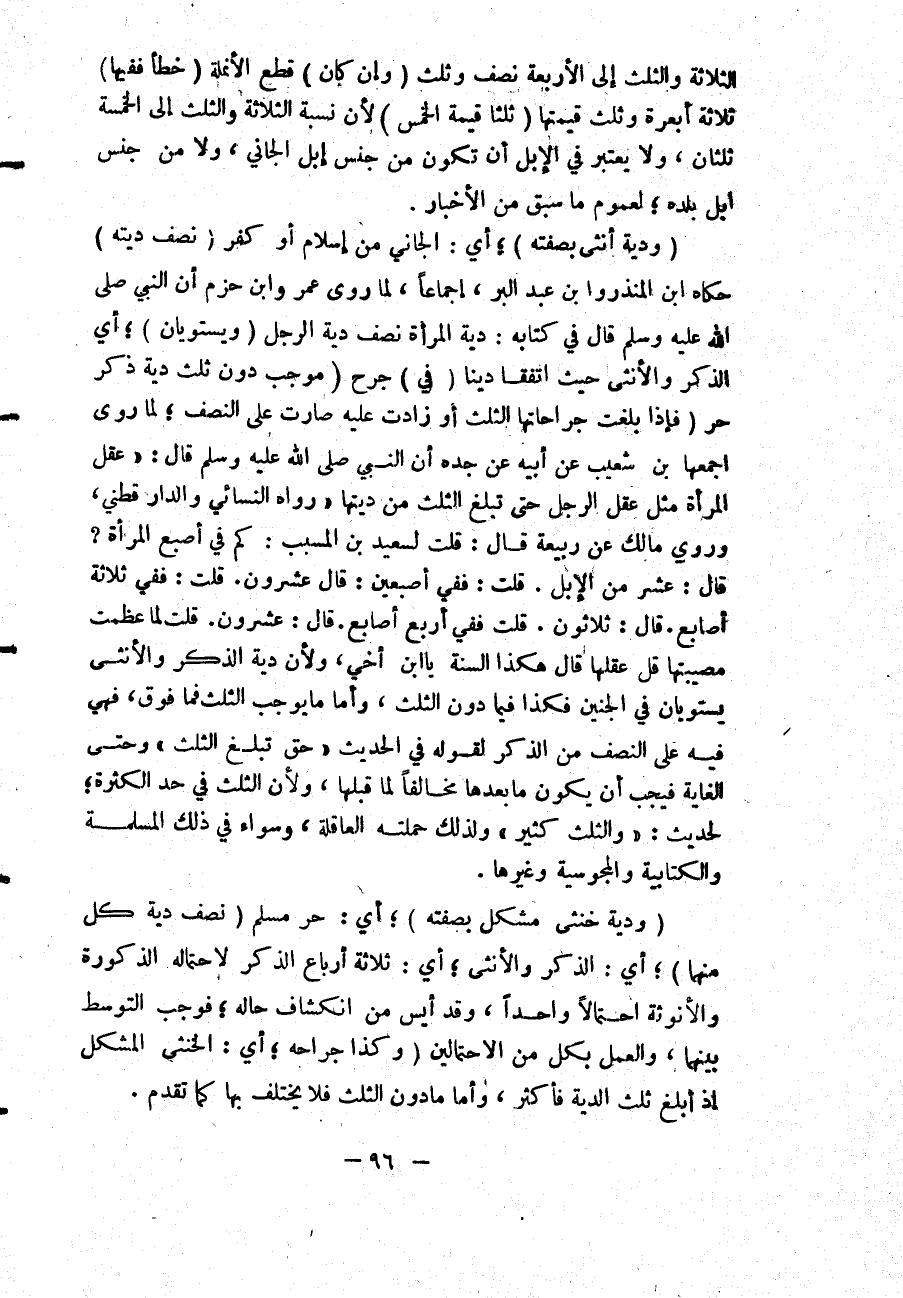 وَرَوَى مَالِكٌ عَنْ رَبِيعَةَ قَالَ: قُلْت لِسَعِيدِ بْنِ الْمُسَيِّبِ: «كَمْ فِي أُصْبُعِ الْمَرْأَةِ؟ قَالَ: عَشْرٌ مِنْ الْإِبِلِ. قُلْت: فَفِي أُصْبُعَيْنِ؟ : قَالَ عِشْرُونَ. قُلْت: فَفِي ثَلَاثَةِ أَصَابِعَ؟ قَالَ: ثَلَاثُونَ قُلْت فَفِي أَرْبَعِ أَصَابِعَ؟ قَالَ: عِشْرُونَ. قُلْت: لَمَّا عَظُمَتْ مُصِيبَتُهَا قَلَّ عَقْلُهَا قَالَ: هَكَذَا السُّنَّةُ يَا ابْنَ أَخِي» ؛ وَلِأَنَّ دِيَةَ الذَّكَرِ وَالْأُنْثَى يَسْتَوِيَانِ فِي الْجَنِينِ فَكَذَا فِيمَا دُونَ الثُّلُثِ، وَأَمَّا مَا يُوجِبُ الثُّلُثَ فَمَا فَوْقَ، فَهِيَ فِيهِ عَلَى النِّصْفِ مِنْ الذَّكَرِ؛ لِقَوْلِهِ فِي الْحَدِيثِ «حَتَّى تَبْلُغَ الثُّلُثَ» وَحَتَّى لِلْغَايَةِ فَيَجِبُ أَنْ يَكُونَ مَا بَعْدَهَا مُخَالِفًا لِمَا قَبْلَهَا، وَلِأَنَّ الثُّلُثَ فِي حَدِّ الْكَثْرَةِ؛ لِحَدِيثِ: «وَالثُّلُثُ كَثِيرٌ» ؛ وَلِذَلِكَ حَمَلْته الْعَاقِلَةُ، وَسَوَاءٌ فِي ذَلِكَ الْمُسْلِمَةُ وَالْكِتَابِيَّةُ وَالْمَجُوسِيَّةُ وَغَيْرُهَا.