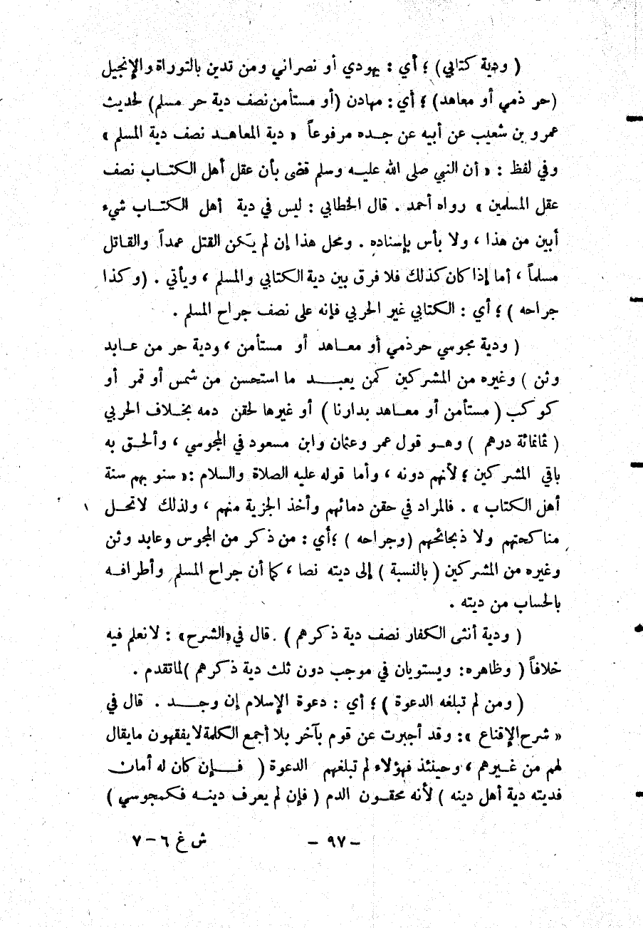 فَالْمُرَادُ فِي حَقْنِ دِمَائِهِمْ وَأَخْذِ الْجِزْيَةِ مِنْهُمْ، وَلِذَلِكَ لَا تَحِلُّ مُنَاكَحَتُهُمْ وَلَا ذَبَائِحُهُمْ (وَجِرَاحُهُ) أَيْ: مَنْ ذَكَرَ مِنْ الْمَجُوسِ وَعَابِدِ وَثَنٍ وَغَيْرِهِ مِنْ الْمُشْرِكِينَ (بِالنِّسْبَةِ) إلَى دِيَتِهِ نَصًّا، كَمَا أَنَّ جِرَاحَ الْمُسْلِمِ وَأَطْرَافَهُ بِالْحِسَابِ مِنْ دِيَتِهِ.