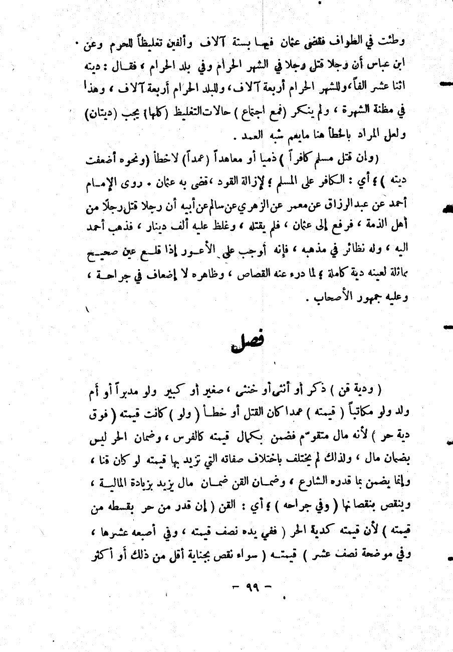 فَصْلٌ (وَدِيَةُ قِنٍّ) ذَكَرٍ أَوْ أُنْثَى أَوْ خُنْثَى، صَغِيرٍ أَوْ كَبِيرٍ وَلَوْ مُدَبَّرًا أَوْ أُمَّ وَلَدٍ وَلَوْ مُكَاتَبًا (قِيمَتُهُ) عَمْدًا كَانَ الْقَتْلُ أَوْ خَطَأً (وَلَوْ) كَانَتْ قِيمَتُهُ (فَوْقَ دِيَةِ حُرٍّ) ؛ لِأَنَّهُ مَالٌ مُتَقَوِّمٌ فَضُمِنَ بِكَمَالِ قِيمَتِهِ كَالْفَرَسِ، وَضَمَانُ الْحُرِّ لَيْسَ بِضَمَانِ مَالٍ، وَلِذَلِكَ لَمْ يَخْتَلِفْ بِاخْتِلَافِ صِفَاتِهِ الَّتِي تَزِيدُ بِهَا قِيمَتُهُ لَوْ كَانَ قِنًّا، وَإِنَّمَا يُضْمَنُ بِمَا قَدَّرَهُ الشَّارِعُ، وَضَمَانُ الْقِنِّ ضَمَانُ مَالٍ يَزِيدُ بِزِيَادَةِ الْمَالِيَّةِ، وَيَنْقُصُ بِنُقْصَانِهَا.