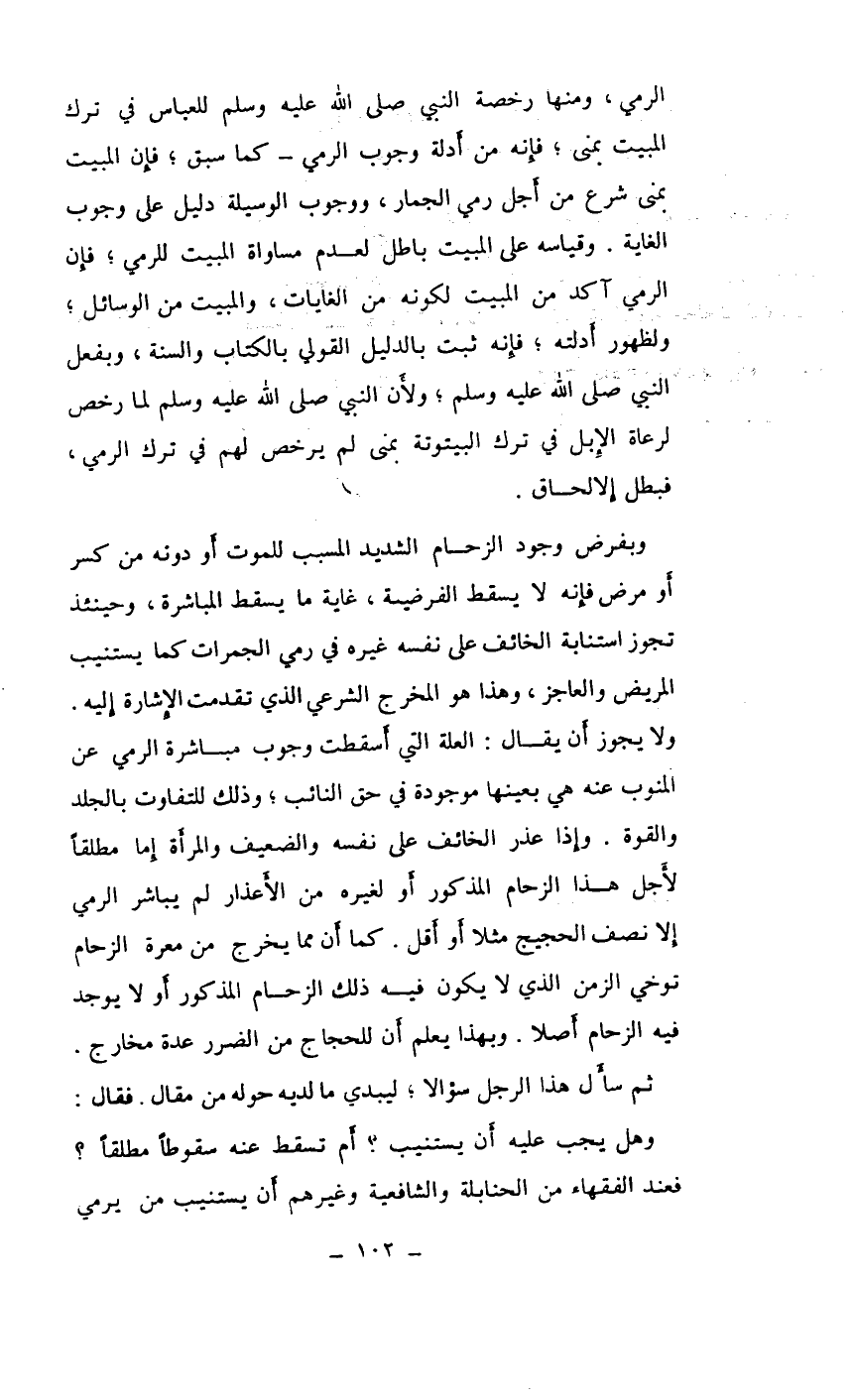 ولا يجوز أن يقال: العلة التي أسقطت وجوب مباشرة الرمي عن المنوب عنه هي بعينها موجودة في حق النائب، وذلك للتفاوت بالجلد والقوة. وإذا عذر الخائف على نفسه والضعيف والمرأة إما مطلقاً لأجل هذا الزحام المذكور أو لغيره من الأعذار لم يباشر الرمي إلا نصف الحجيج مثلاً أو أقل. كما أن مما يخرج من معرة الزحام توخي الزمن الذي لا يكون فيه ذلك الزحام المذكور أو لا يوجد فيه الزحام أصلاً. وبهذا يعلم أن للحجاج من الضرر عدة مخارج.
