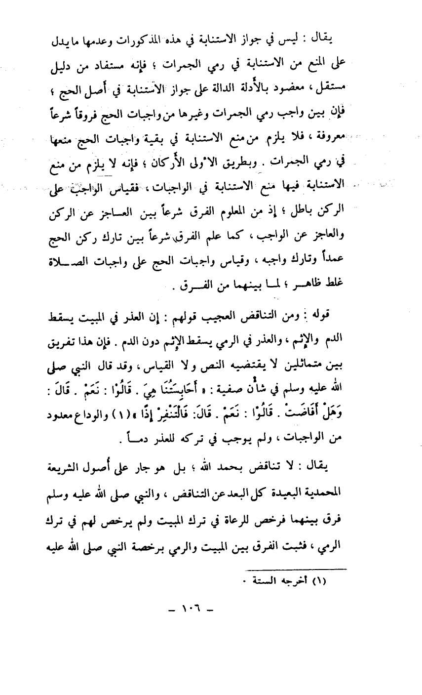 يقال: ليس في جواز الاستنابة في هذه المذكورات وعدمها ما يدل على المنع من الاستنابة في رمي الجمرات، فإنه مستفاد من دليل مستقل، معضود بالأدلة الدالة على جواز الاستنابة في أصل الحج، فإن بين واجب رمي الجمرات وغيرها من واجبات الحج فروقاً شرعاً معروفة، فلا يلزم من منع الاستنابة في بقية واجبات الحج منعها في رمي الجمرات. وبطريق الأولى الأركان، فإنه لا يلزم من منع الاستنابة فيها منع الاستنابة في الواجبات، فقياس الواجب على الركن باطل، إذ من المعلوم الفرق شرعاً بين العاجز عن الركن والعاجز عن الواجب، كما علم الفرق شرعاً بين تارك ركن الحج عمداً وتارك واجبه، وقياس واجبات الحج على واجبات الصلاة غلط ظاهر، لما بينهما من الفرق.