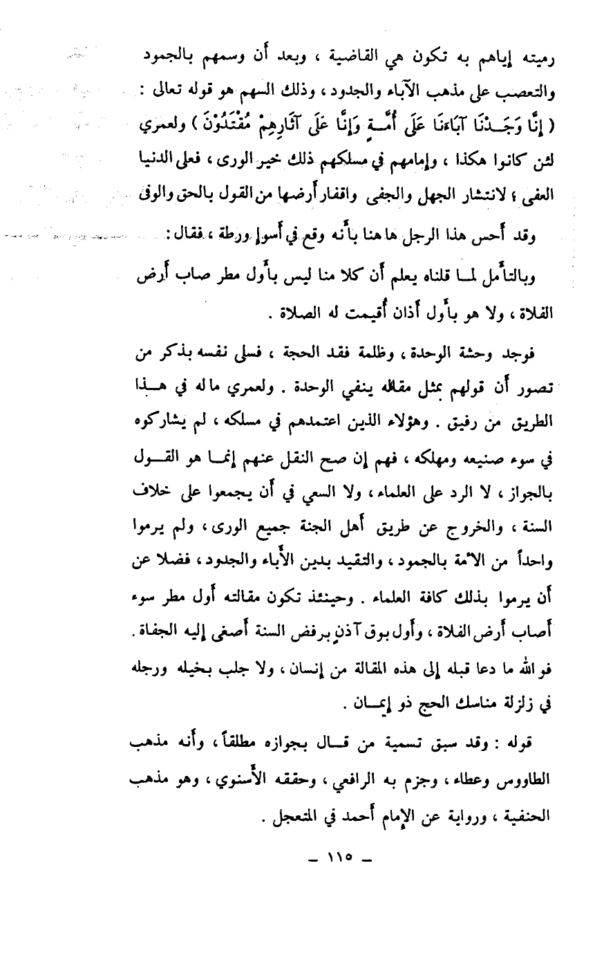فوجد وحشة الوحدة، وظلمة فقد الحجة، فسلى نفسه بذكر من تصور أن قولهم بمثل مقاله ينفي الوحدة. ولعمري ما له في هذا الطريق من رفيق. وهؤلاء الدين اعتمدهم في مسلكه، لم يشاركوه في سوء صنيعه ومهلكه، فهم إن صح النقل عنهم إنما هو القول بالجواز، لا الرد على العلماء، ولا السعي في أن يجمعوا على خلاف السنة، والخروج عن طريق أهل الجنة جميع الورى، ولم يرموا واحداً من الأمة بالجمود، والتقيد بدين الأباء والجدود، فضلاً أن يرموا بذلك كافة العلماء. وحينئذ تكون مقالته أول مطر سوء أصاب أرض الفلاة، وأول بوق آذنٍ برفض السنة أصغى إليه الجفاة. فو الله ما دعا قبله إلى هذه المقالة من إنسان، ولا جلب بخيله ورجله في زلزلة مناسك الحج ذو إيمان.