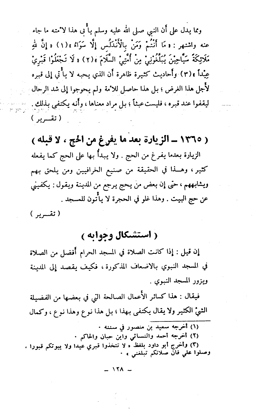 (¬3) وأخرج أبو داود بلفظ " لا تتخذوا قبري عيداً ولا بيوتكم قبوراً، وصلوا عليّ فإن صلاتكم تبلغني".