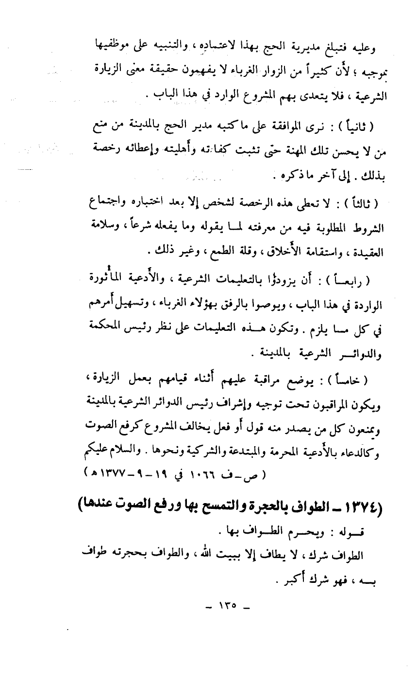 وعليه فتبلغ مديرية الحج بهذا لاعتماده، والتنبيه على موظفيها بموجبه، لأن كثيراً من الزوا ر الغرباء لا يفهمون حقيقة معنى الزيارة الشرعية، فلا يتعدى بهم المشروع الوارد في هذا الباب.