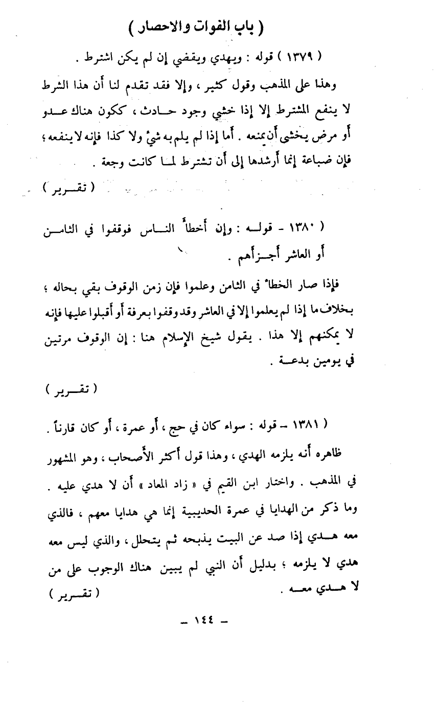 وهذا على المذهب وقول كثير، وإلا فقد تقدم لنا أن هذا الشرط لا ينفع المشترط إلا إذا خشي وجود حادث، ككون هناك عدو أو مرض يخشى أن يمنعه. أما إذا لم يلم به شيء ولا كذا فإنه لا ينفعه، فإن ضباعة إنما أرشدها إلى أن تشترط لما كانت وجعة. ... (تقرير)