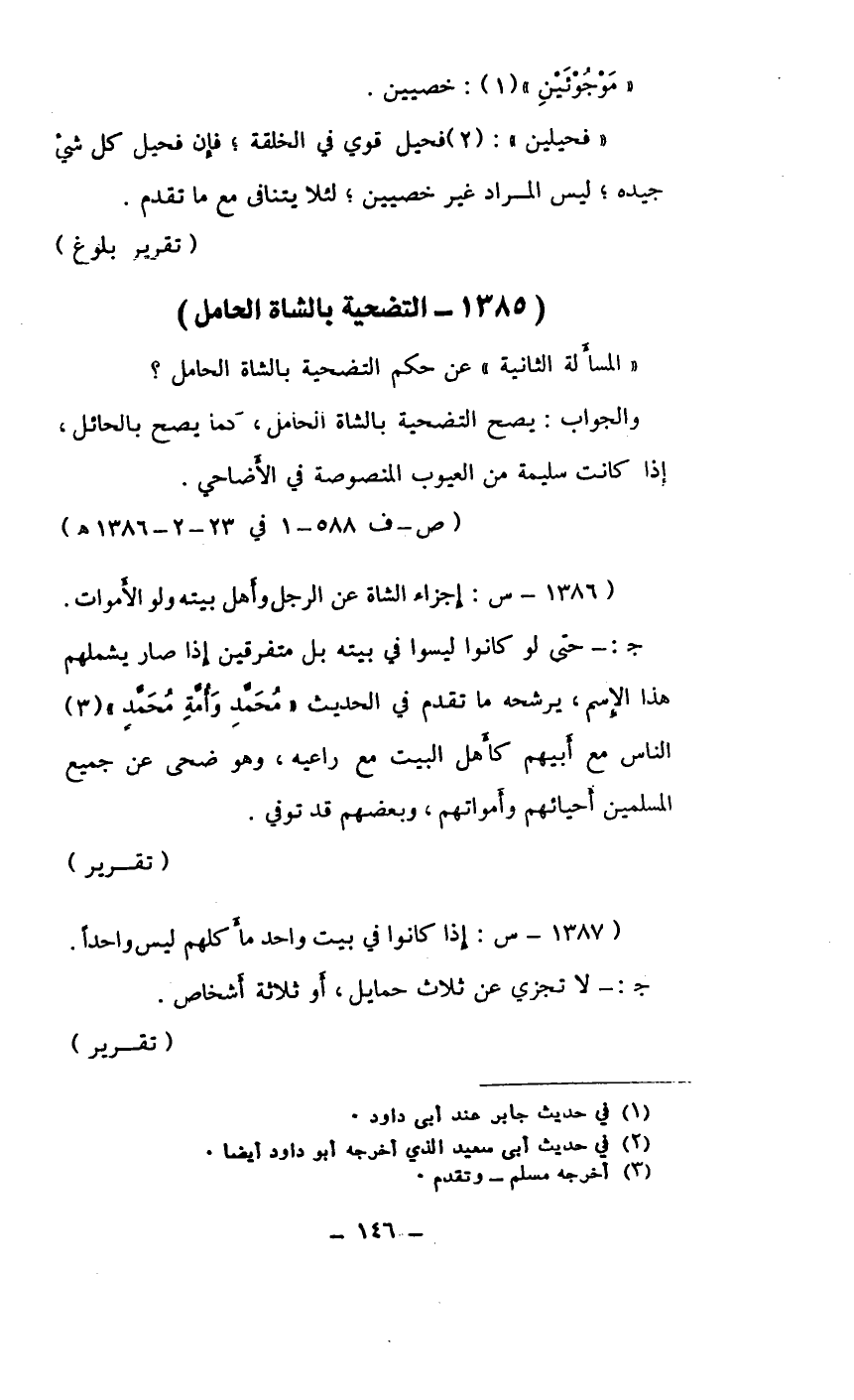 جـ: حتى لو كانوا ليسوا في بيته بل متفرقين إذا صار يشملهم هذا الإسم، يرشحه ما تقدم في الحديث" محمد وأمة محمد" (¬3) الناس مع أبيهم كأهل البيت مع راعيه، وهو ضحى عن جميع المسلمين أحيائهم وأمواتهم، وبعضهم قد توفي. ... (تقرير)