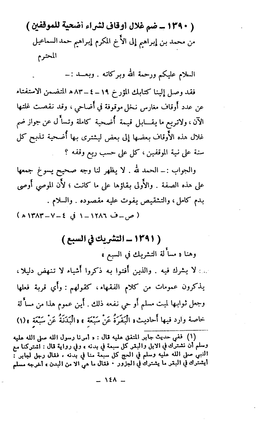 فقد وصل إلينا كتابك المؤرخ 19/4/83هـ المتضمن الاستفتاء عن عدد أوقاف مغارس نخل نوقوفة في أضاحي، وقد نقصت غلتها الآن، ولا تريع ما يقابل قيمة أضحية كاملة وتسأل عن جواز ضم غلال هذه الأوقاف بعضها إلى بعض ليشتري بها أضحية تذبح كل سنة على نية الموقفين، كل على حسب ريع وقفه؟