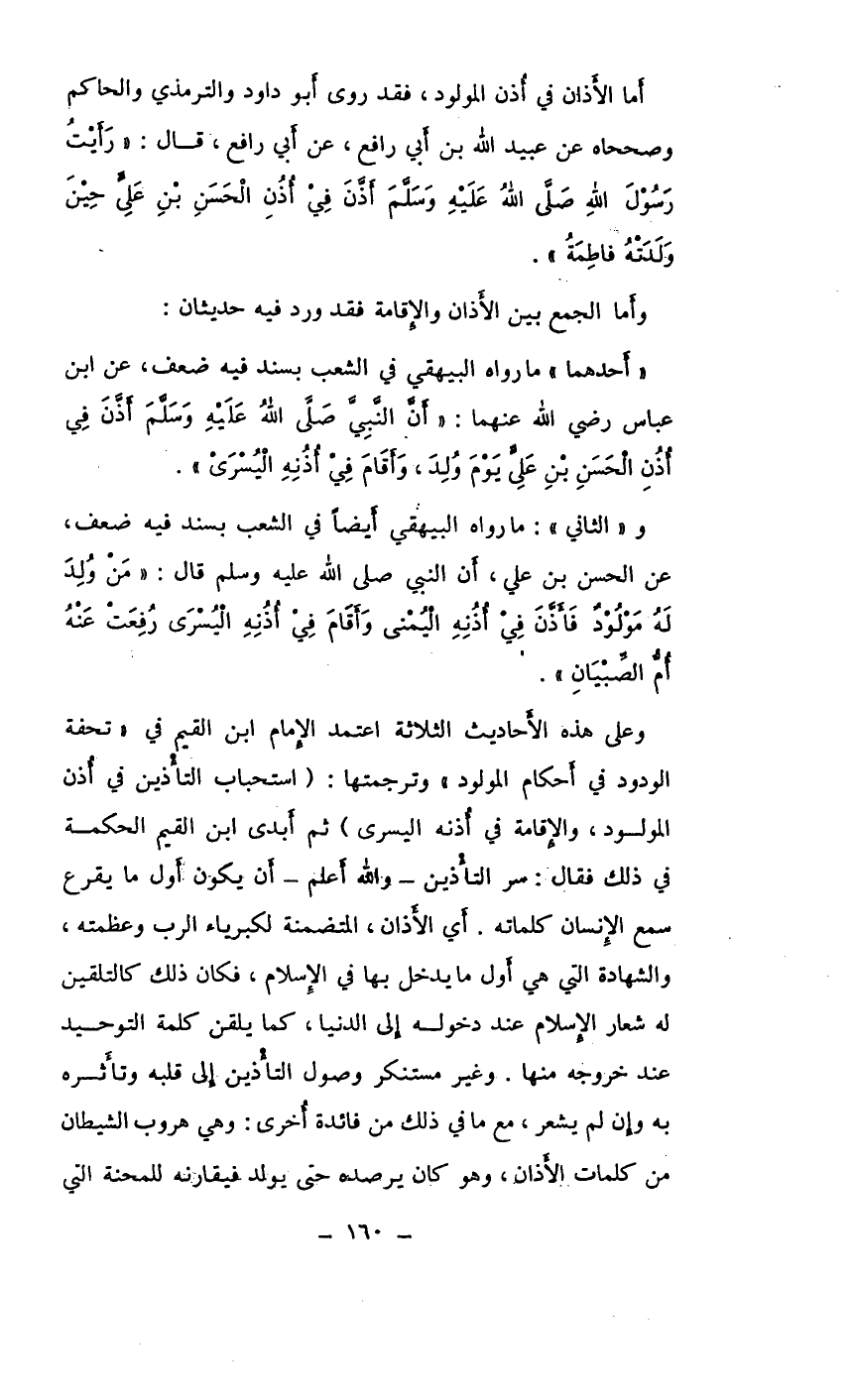 و" الثاني " ما رواه البيهقي أيضاً في الشعب بسند فيه ضعف عن الحسن بن علي، أن النبي صلى الله عليه وسلم قال: " من ولد له مولود فأذن في أذنه اليمنى وأقام في أذنه اليسرى رفعت عنه أم الصبيان ".
