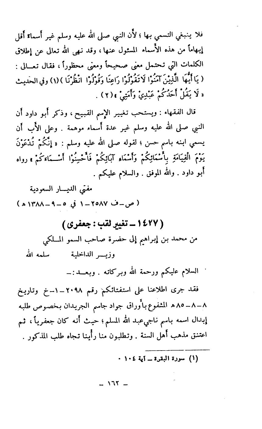 فقد جرى اطلاعنا على استفتائكم رقم 2098 ـ 1 ـ خ وتاريخ 8/8/85هـ المشفوع بأوراق جواد جاسم الجريدان بخصوص طلبه إبدال اسمه باسم ناجي عبد الله المسلم، حيث أنه كان جعفرياً، ثم اعتنق مذهب أهل السنة. وتطلبون منا رأينا تجاه طلب المذكور.