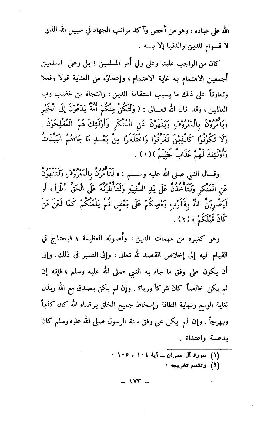 كان من الواجب علينا وعلى ولي أمر المسلمين، بل وعلى المسلمين أجمعين الاهتمام به غاية الاهتمام، وإعطاؤه من العناية قولاً وفعلاً وتعاوناً على ذلك ما يسبب استقامة الدين، والنجاة من غضب رب العالمين، وقد قال الله تعالى: {ولتكن منكم أمة يدعون إلى الخير ويأمرون بالمعروف وينهون عن المنكر وأولئك هم المفلحون. ولا تكونوا كالذين تفرقوا واختلفوا من بعد ما جاءهم البينات وأولئك لهم عذاب عظيم} (¬1) .