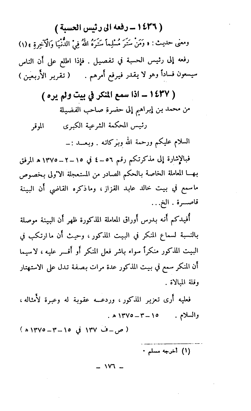 من محمد بن إبراهيم إلى صاحب الفضيلة ... رئيس المحكمة الشرعية الكبرى الموقر