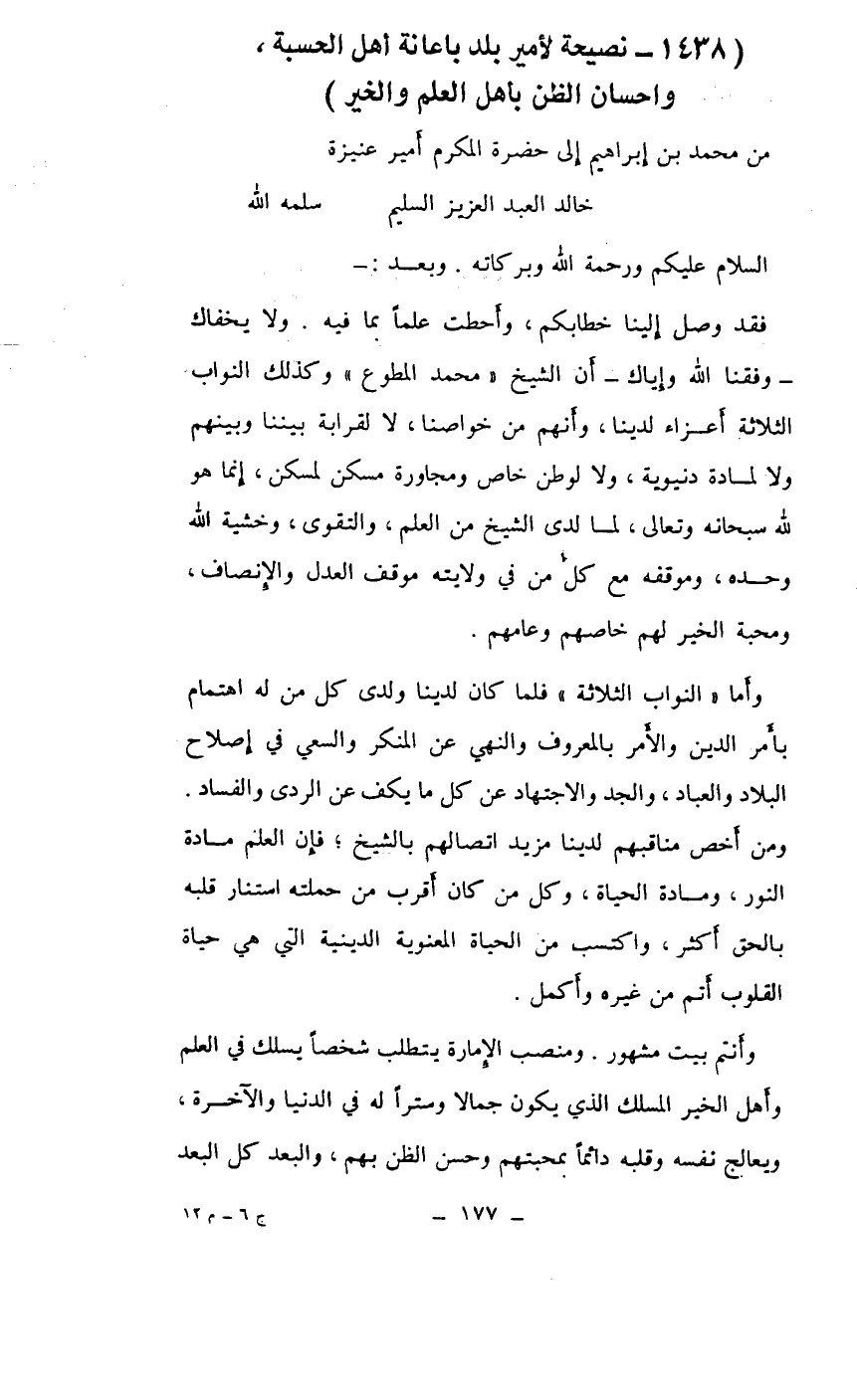 من محمد بن إبراهيم إلى حضرة المكرم أمير عنيزة خالد العبد العزيز السليم ... سلمه الله
