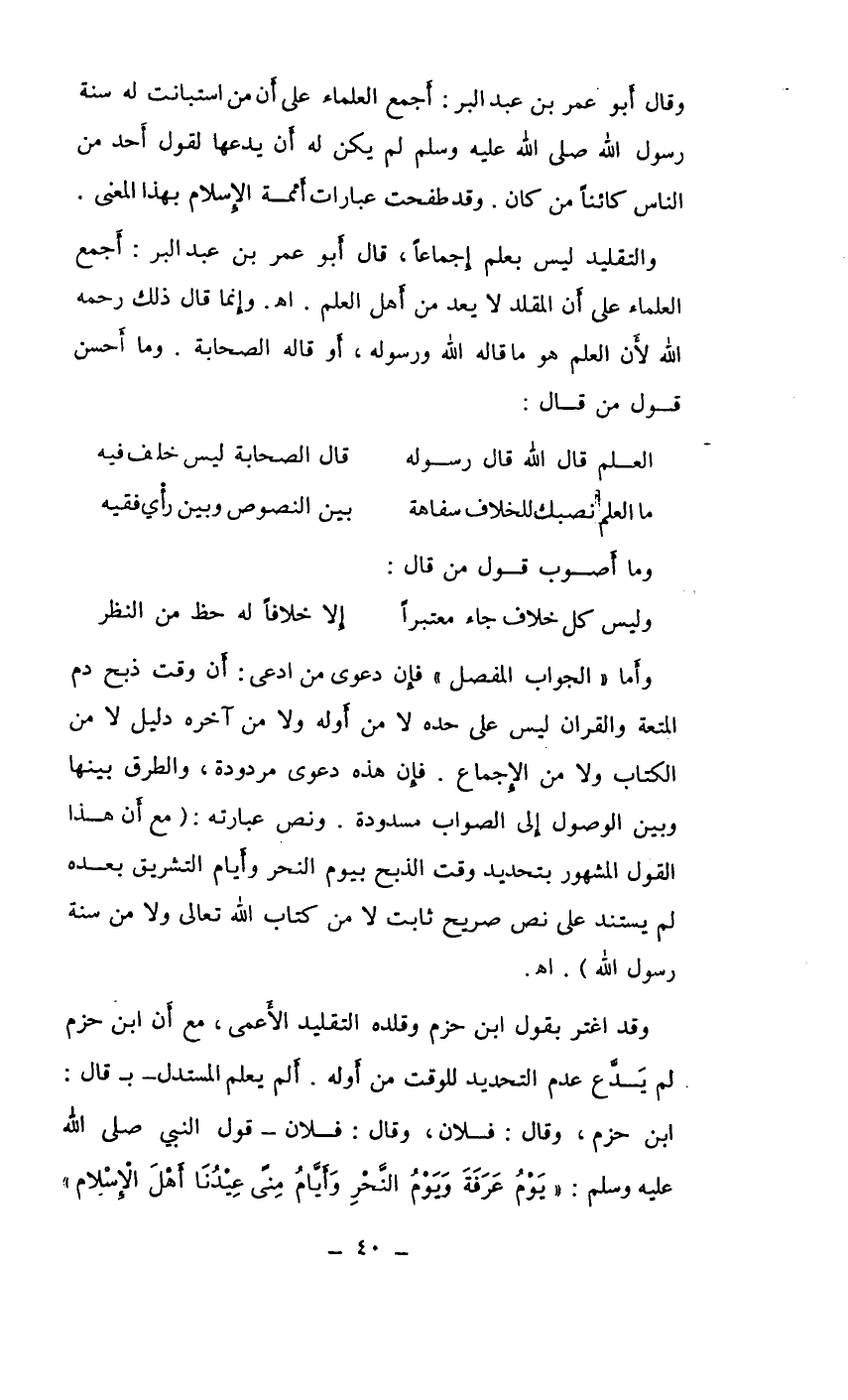 وأما " الجواب المفصل " فإن دعوى من ادعى: أن وقت ذبح دم المتعة والقران ليس على حده لا من أوله ولا من آخره دليل لا من الكتاب ولا من الإجماع. فإن هذه دعوى مردودة، والطرق بينها وبين الوصول إلى الصواب مسدودة. ونص عبارته) مع أن هذا القول المشهور بتحديد وقت الذبح بيوم النحر وأيام التشريق بعده لم يستند على نص صريح ثابت لا من كتاب الله تعالى ولا من سنة رسول الله) اهـ.