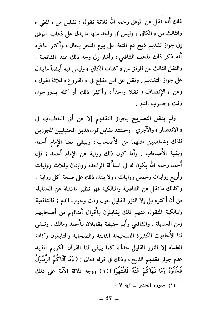 وكذلك ما نقل عن الشافعية والمالكية فهو نظير ما نقله عن الحنابلة من أن أكثره بل إلا النزر القليل حول وقت وجوب الدم، فالشافعية والمالكية المنقول عنهم ذلك يقابلون بأقوال أمثالهم من أصحابهم ومن الحنابلة. والشافعي وأبو حنيفة يقابلان بأحمد ومالك. وتبقى لنا الأحاديث الكثيرة الصحيحة الثابتة والصحابة والتابعون وكافة العلماء إلا النزر القليل جداً، كما يبقى لنا القرآن الكريم المفيد عدم جواز تقديم الذبح، وذلك في قوله تعالى {وما آتاكم الرسول فخذوه وما نهاكم عنه فانتهوا} (¬1) ووجه دلالة الآية على ذلك